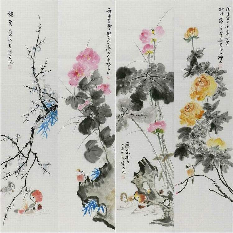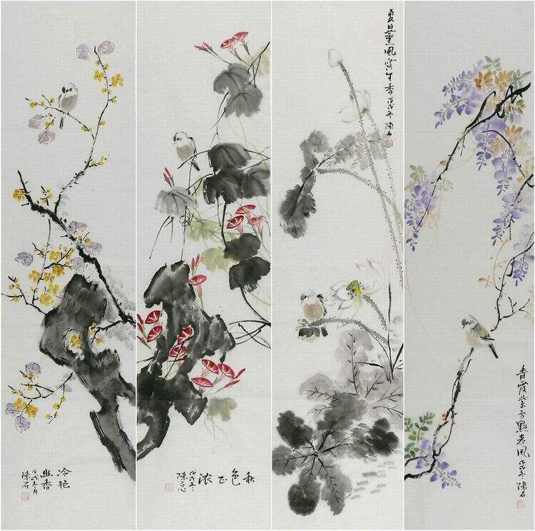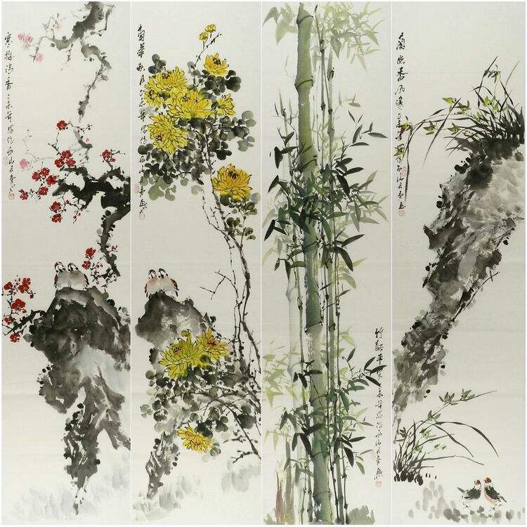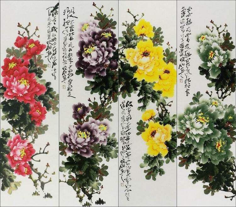 📚 牡丹国画四条屏花鸟画纯手绘字画办公室装饰画张浪伯 陈石 丹青GG