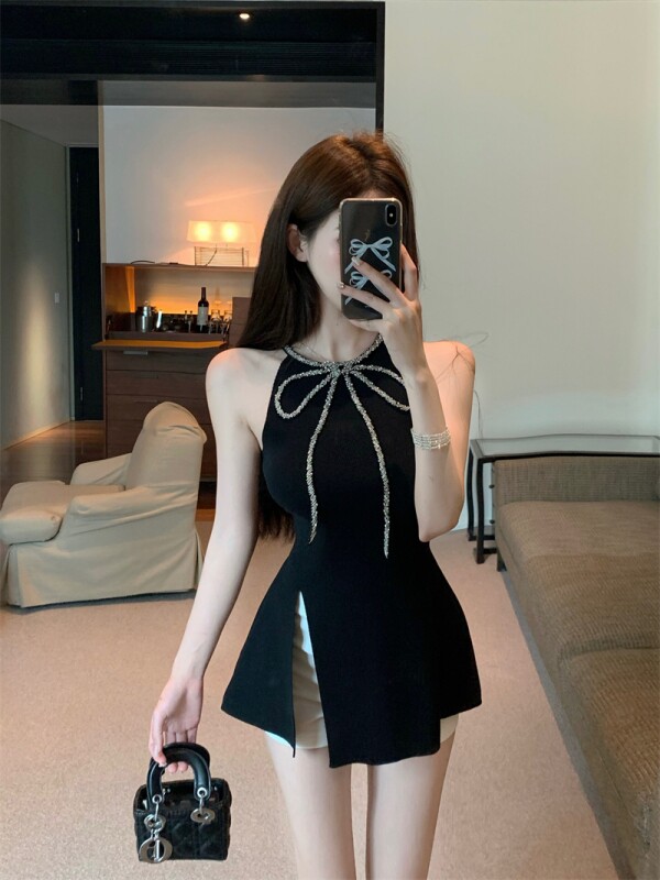 📚 实拍实价 纯欲辣妹重工镶钻蝴蝶结气质优雅赫本吊带裙小黑裙短裙