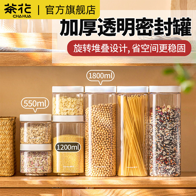 📚 茶花塑料密封罐五谷杂粮面条厨房储物罐密封盒家用收纳罐透明罐子