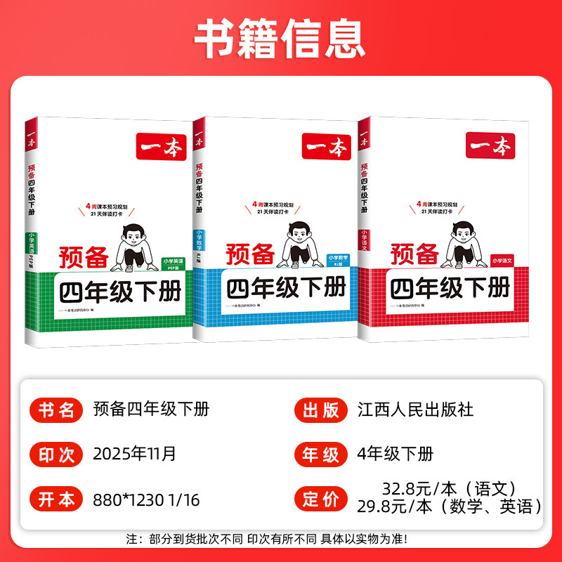 📚 一本预备四年级下册语文英语数学人教北师苏教译林课本同步练习册预习复习强化训练阅读口计算应用题基础巩固寒假衔接作业每日一练
