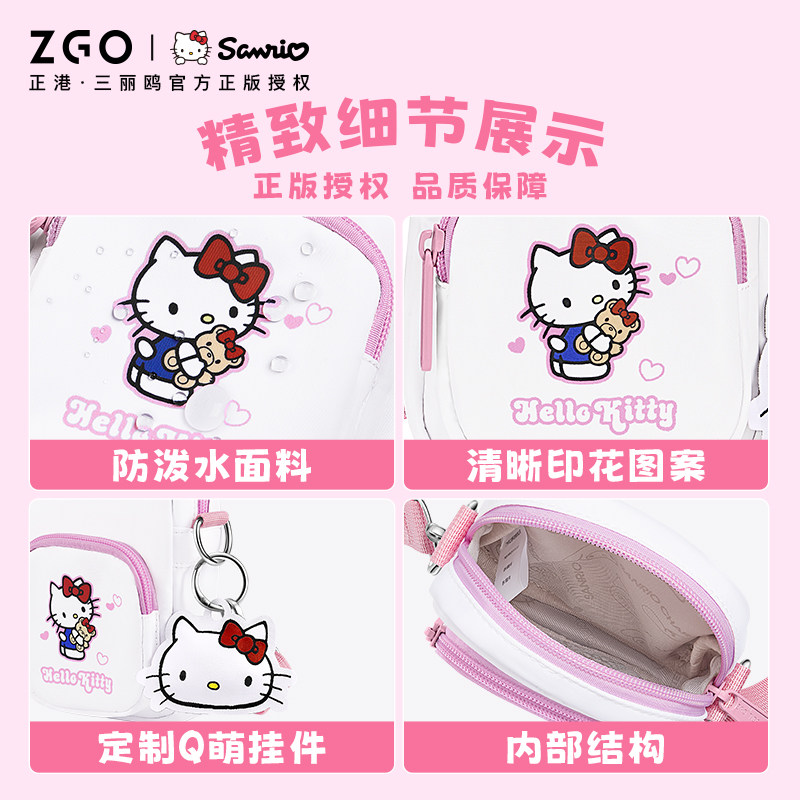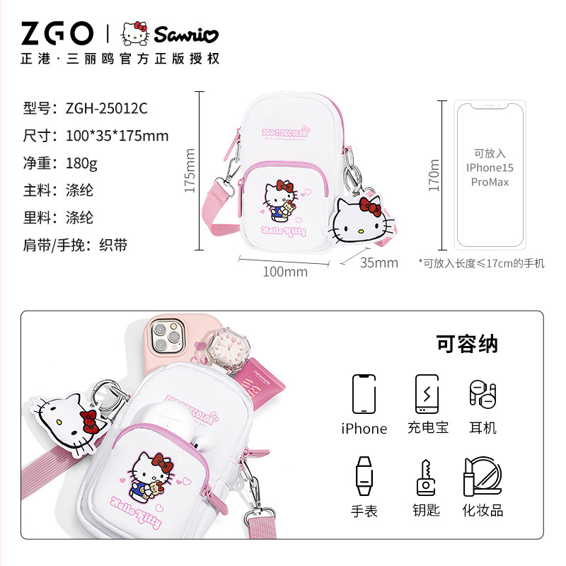 👜 外观上,这款斜挎手机包采用了可爱的hellokitty和凯蒂猫的元素,简直让人爱不释手。无论是颜色还是设计,都充满了童趣和可爱。