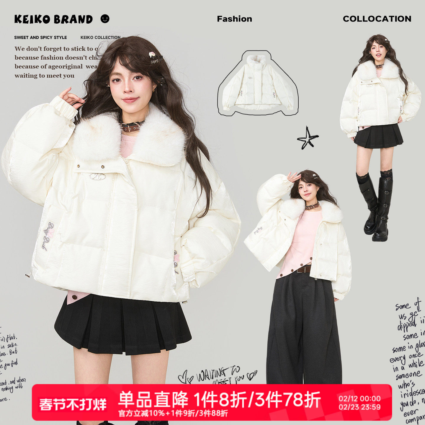 📚 KEIKO 流光缎面短款棉服棉袄冬季可卸环保狐狸毛领白色外套面包服