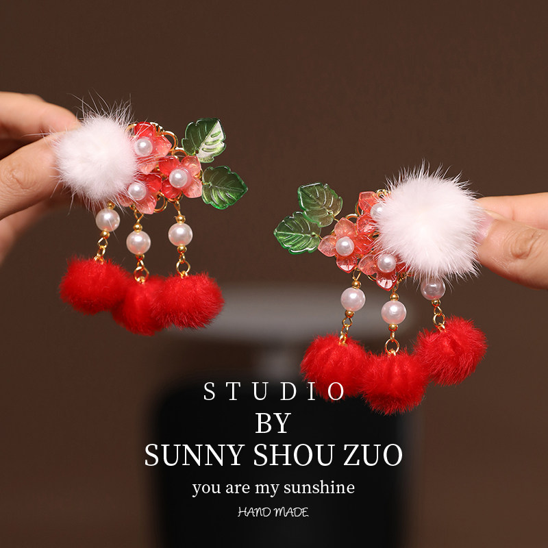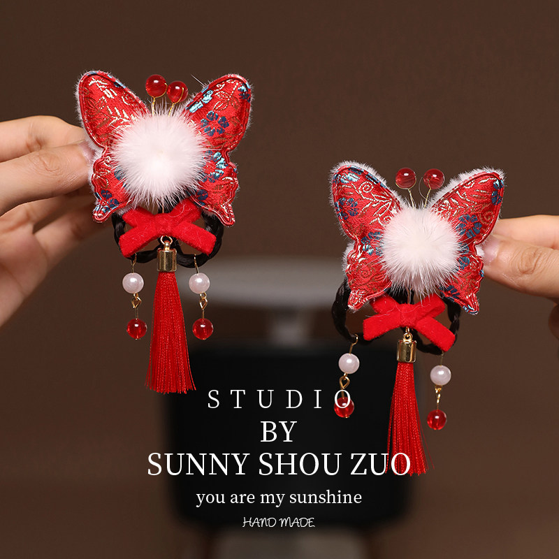 📚 女童古风汉服头饰儿童粉色毛球兔耳对夹宝宝新年红色发夹拜年发饰