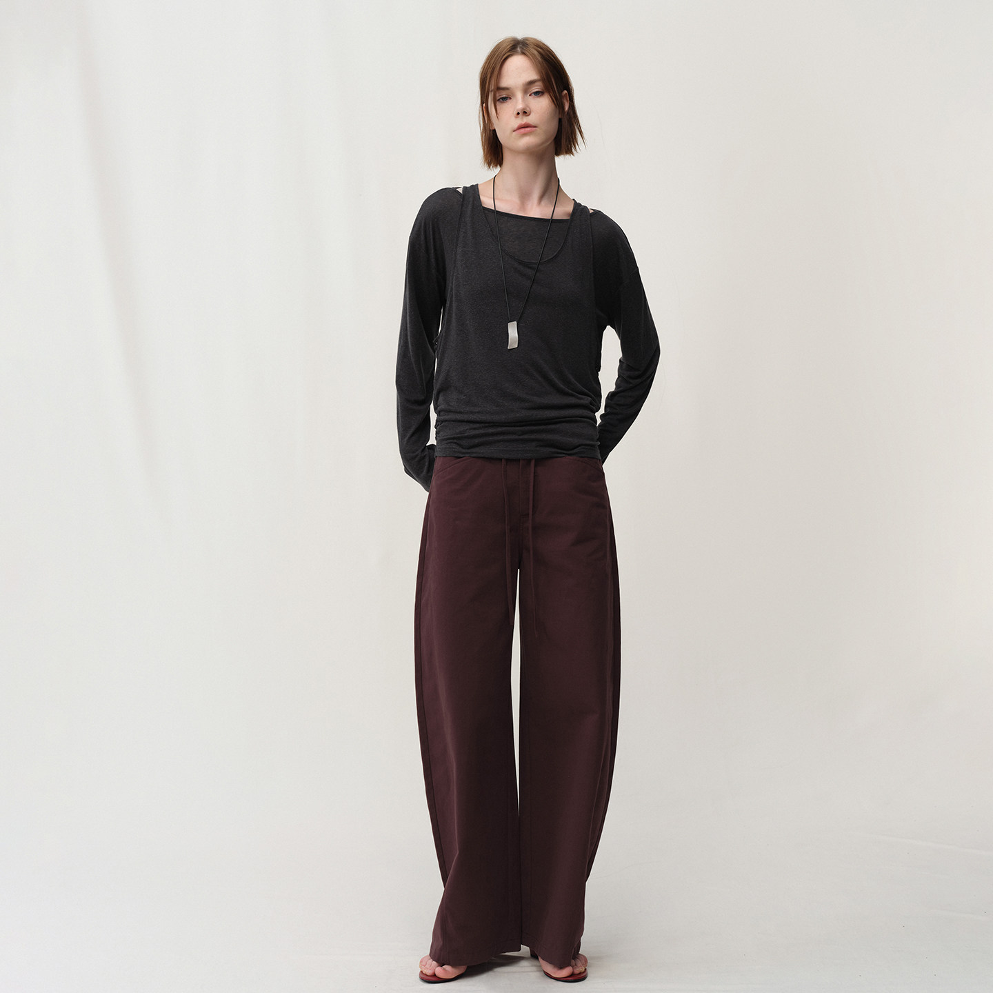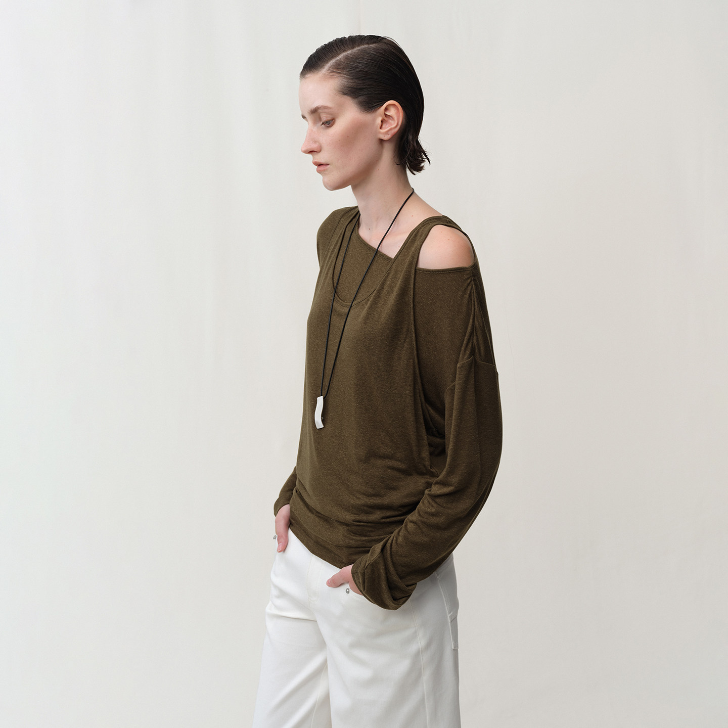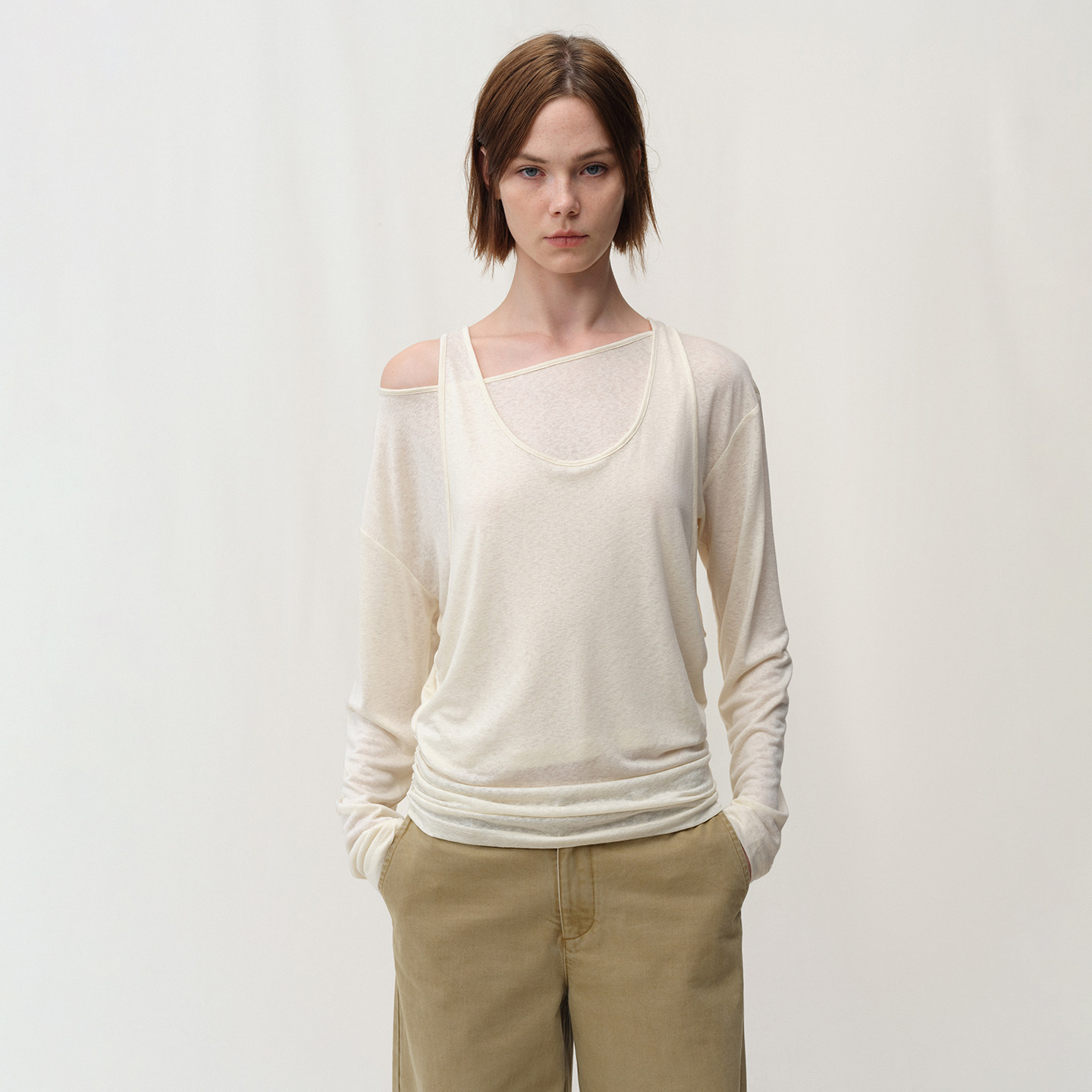 📚 SMIIILE假两件天丝亚麻斜肩露肩亲肤上衣女秋褶皱堆叠感长袖t恤衫