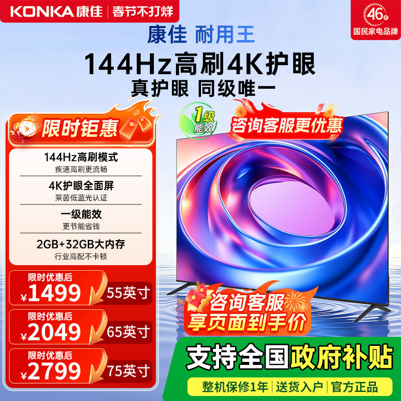 📚 康佳E8AES 55/65/75英寸144Hz高刷智能液晶电视机以旧换新补贴