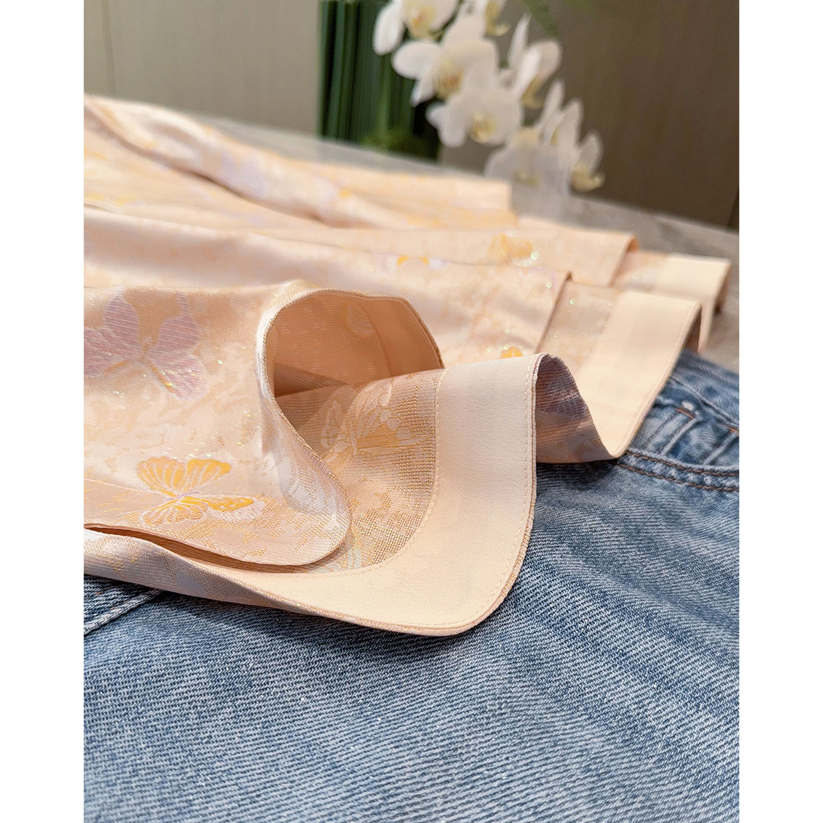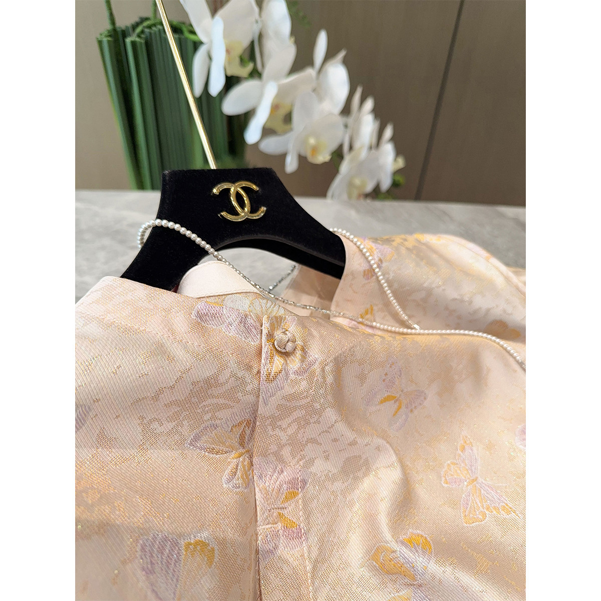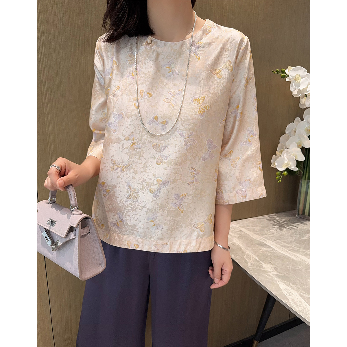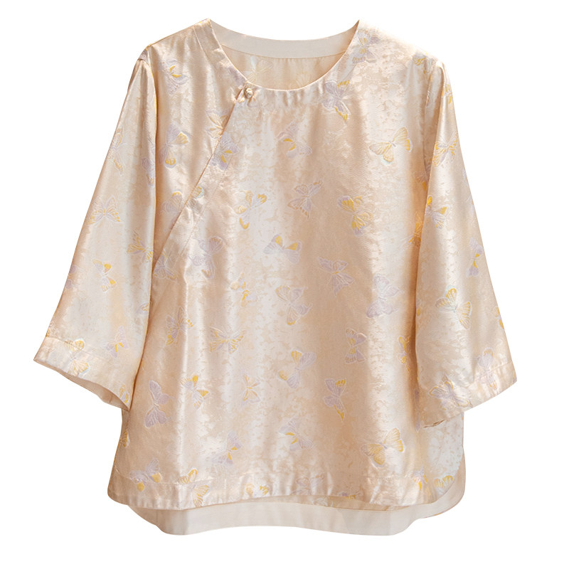 📚 流光溢彩!织金真丝宋锦蝴蝶提花斜襟七分袖新中式桑蚕丝衬衫上衣