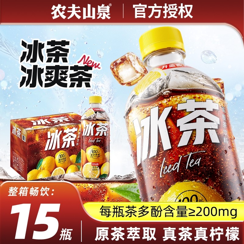 📚 农夫山泉冰茶600ml*15瓶箱装碳酸茶饮料冰柠檬味红茶汽水