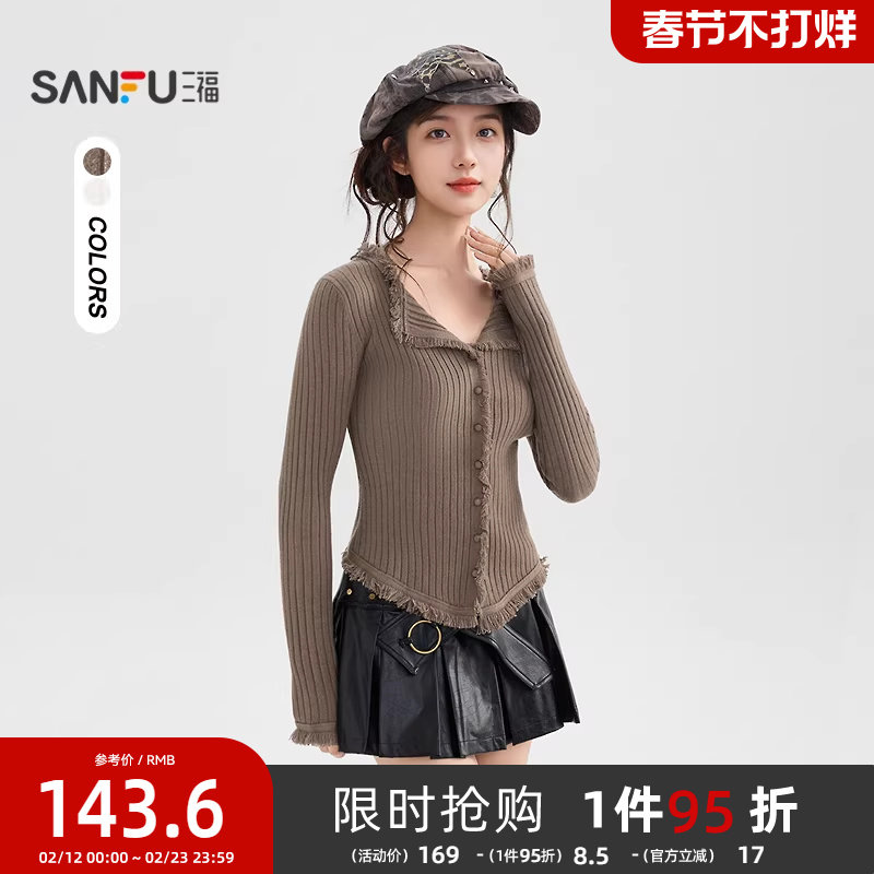 📚 三福开衫毛衣2025新款冬季气质毛须边翻领修身织衫上衣女装513798
