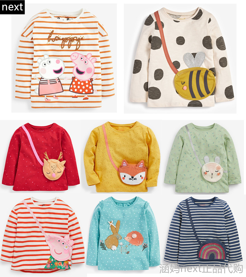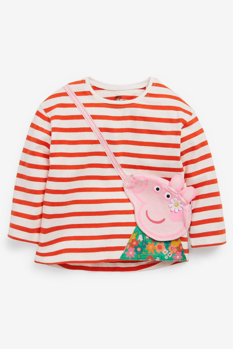 📚 现货英国NEXT童装春秋女童女宝红色条纹小猪佩奇挎包长袖T恤上衣