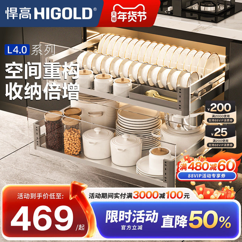 📚 悍高拉篮L4.0系列橱柜双层三层抽屉式内置碗架304不锈钢厨房碗篮