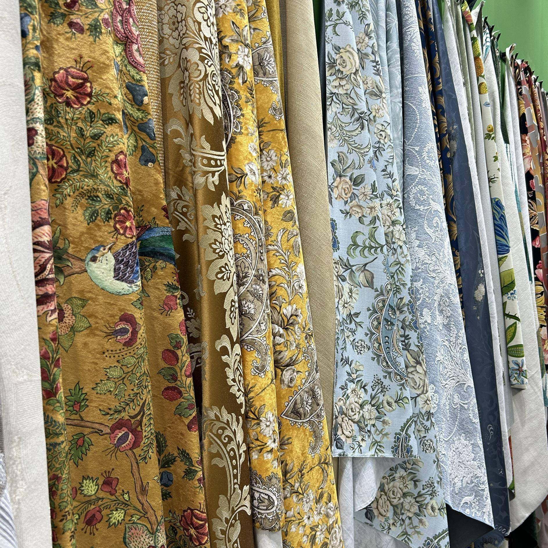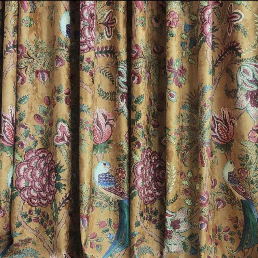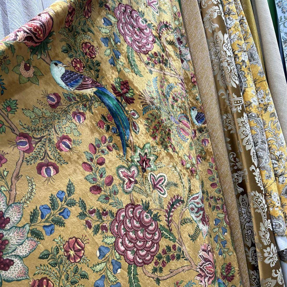 📚 门幅280cm印花花布面料新中式复古古典金黄色花鸟印花绒布窗帘布