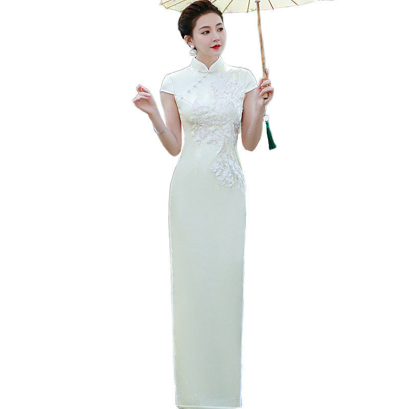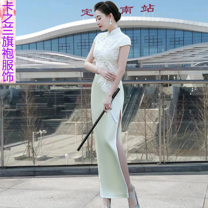 #走秀长款旗袍 #夏季新品 #斜襟包扣蕾丝绣花 #古典修身演出服 #券后价237元