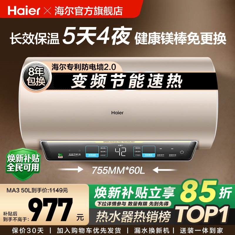 📚 [焕新补贴]海尔电热水器官方家用卫生间洗澡变频一级能效镁棒MA3