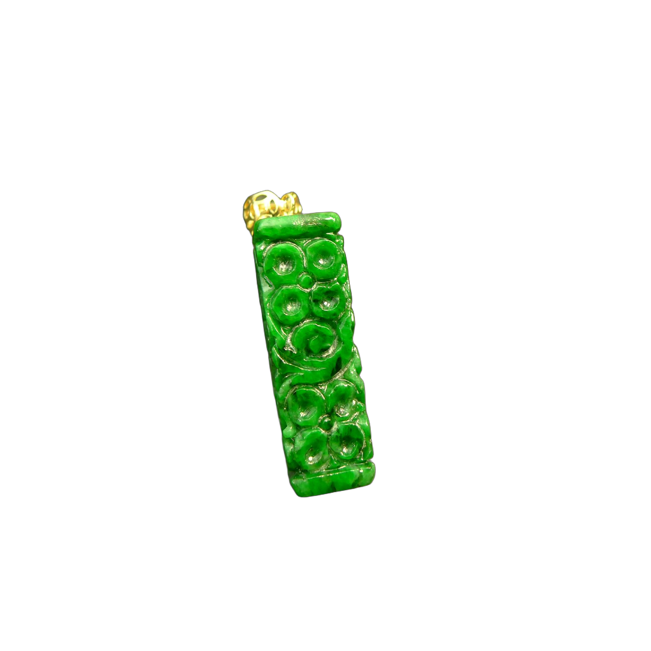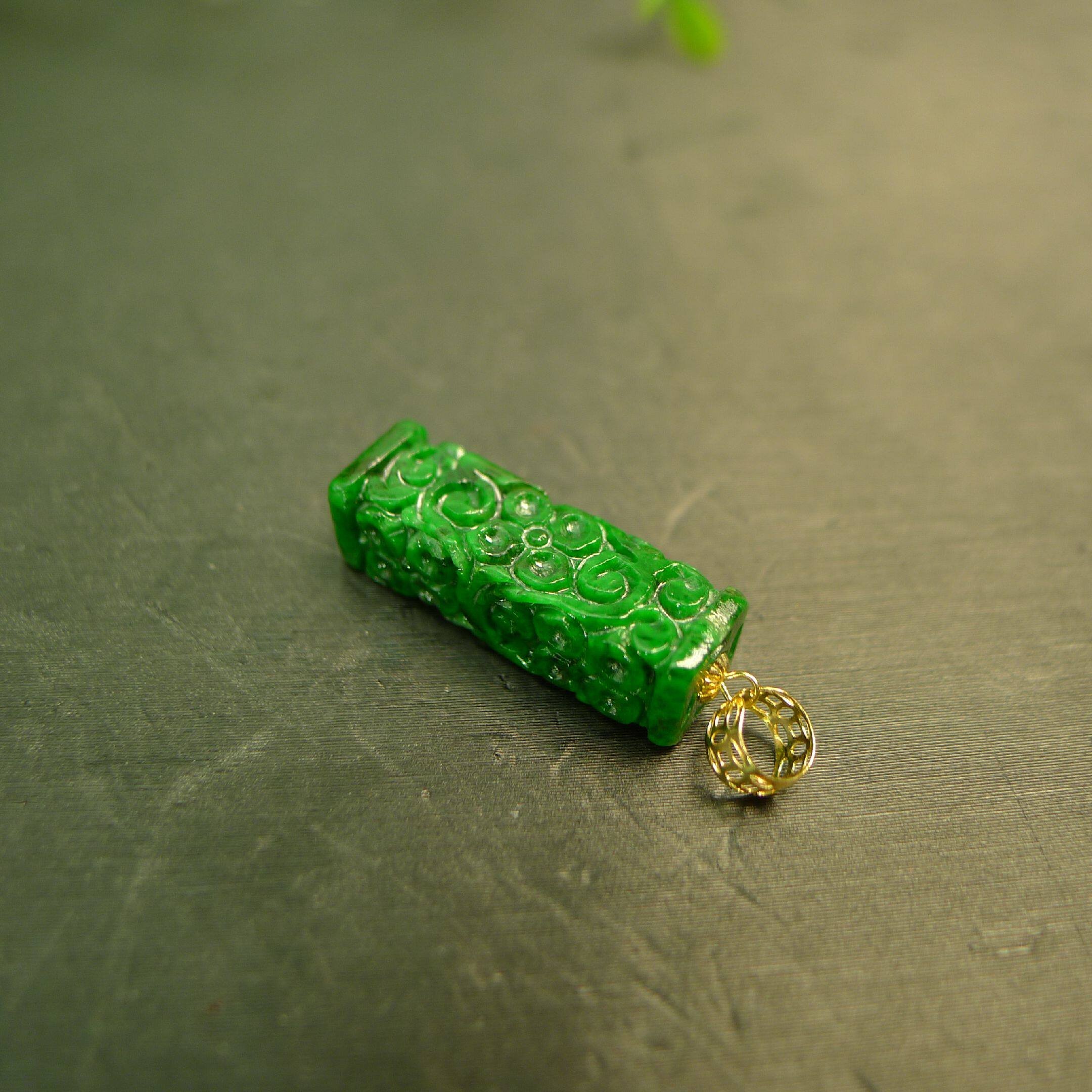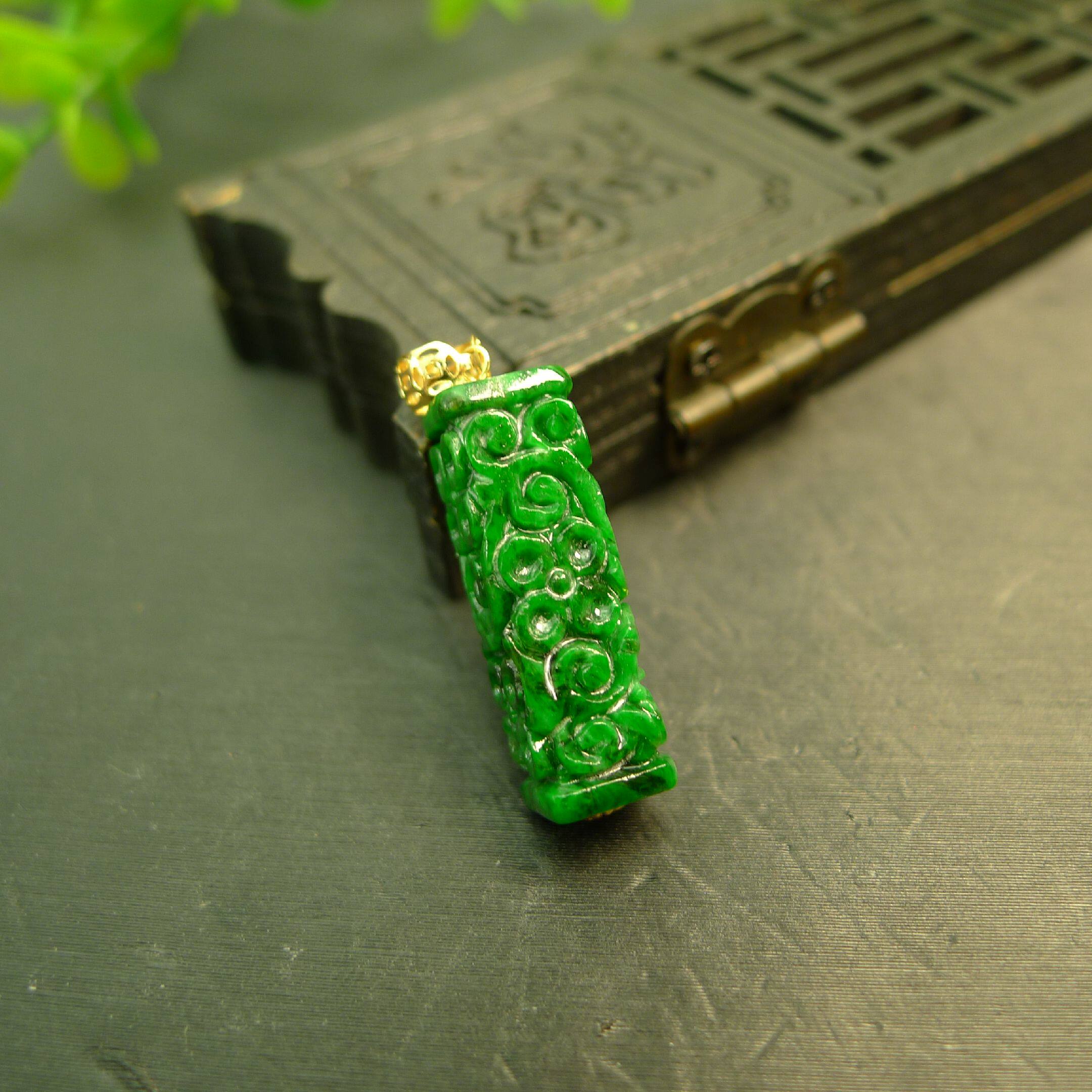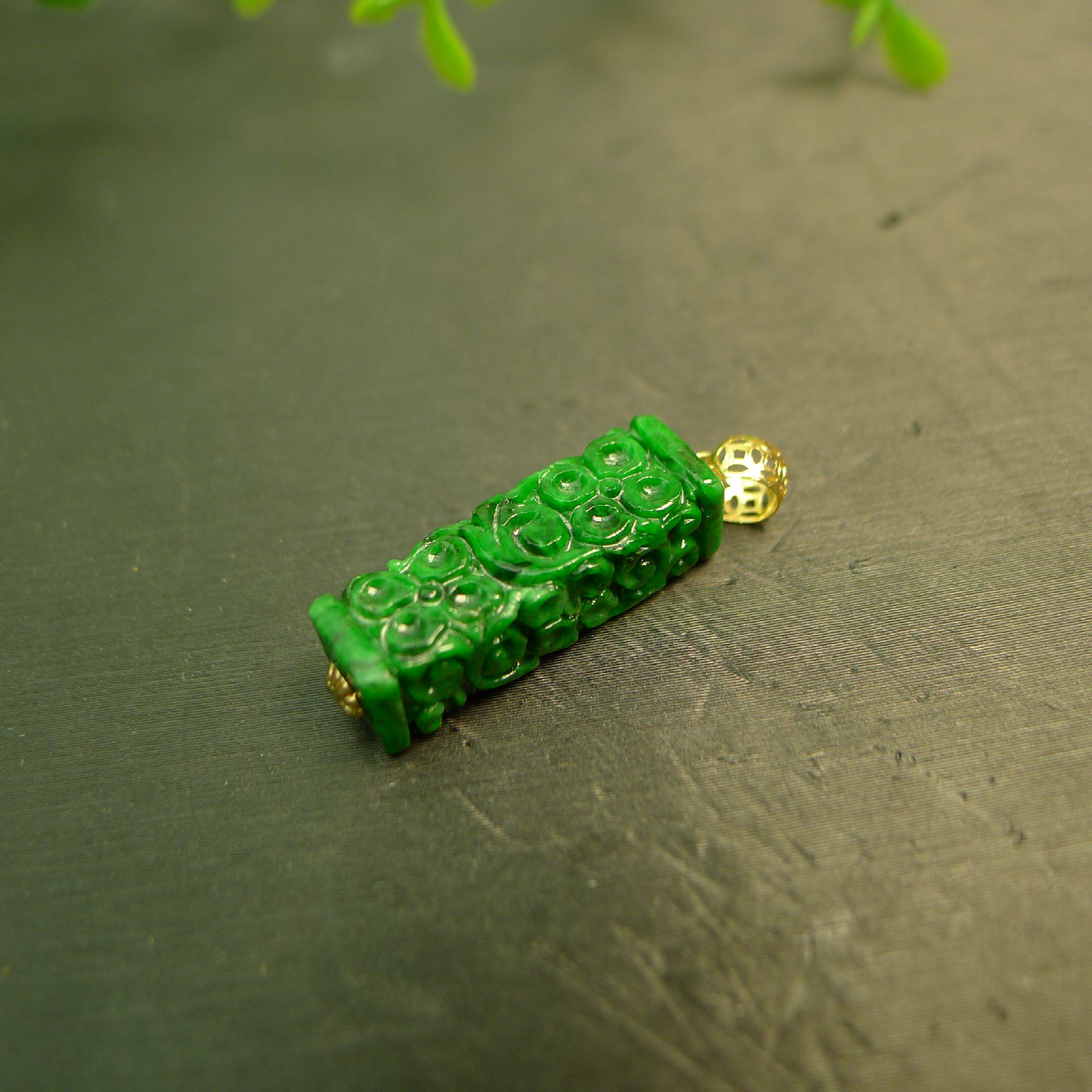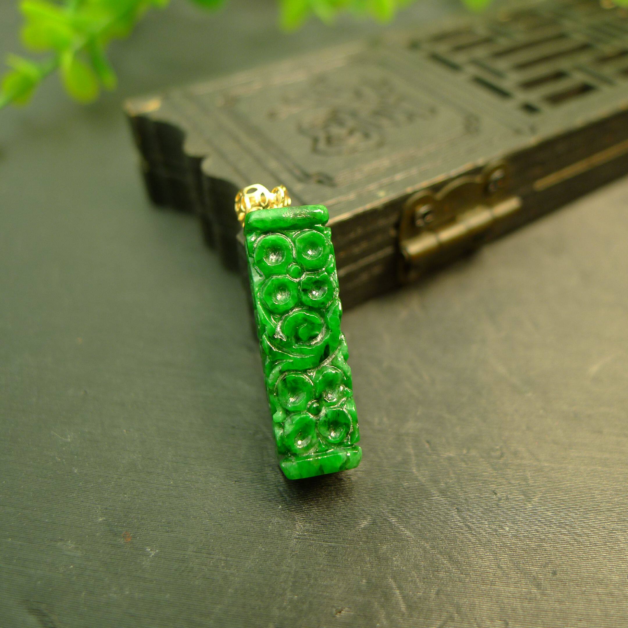 📚 #J105 18K金镶嵌辣绿缅甸天然A货翡翠长方柱条雕花管珠锁骨吊坠