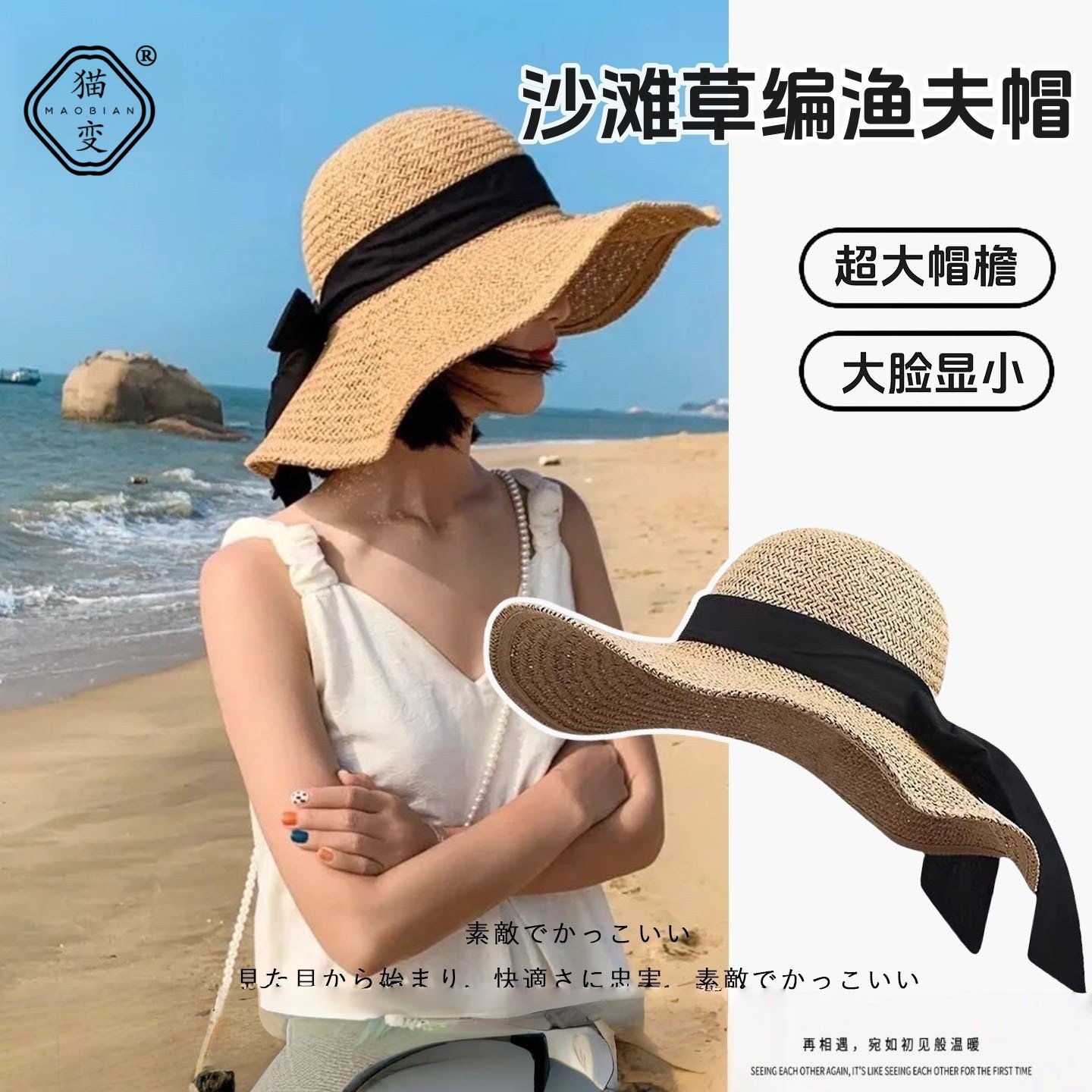 📚 蝴蝶结大帽檐草帽女夏季度假沙滩防晒草编帽可折叠遮阳海边太阳帽