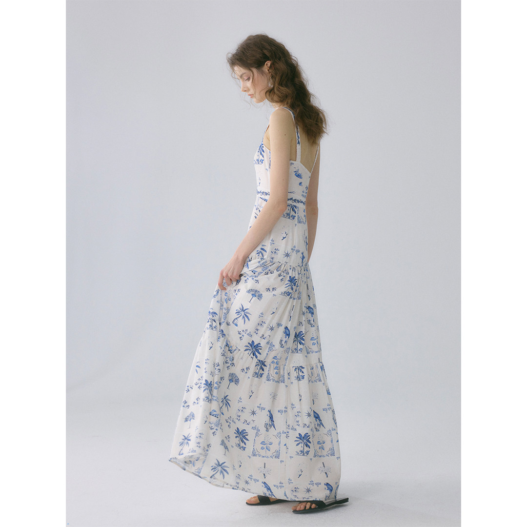 📚 SOFTSELF慵懒春雾春季新款蓝色印花刺绣吊带连衣裙女