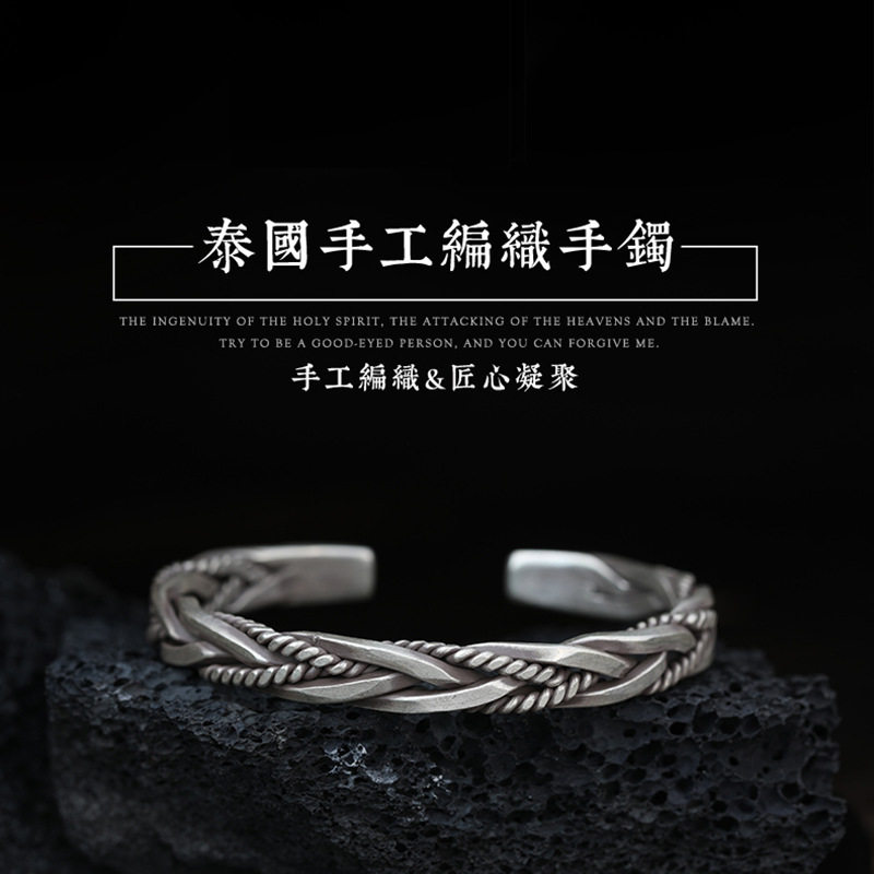 📚 麻花编织S925银手镯男女复古个性泰银手环原创小众设计开口手饰