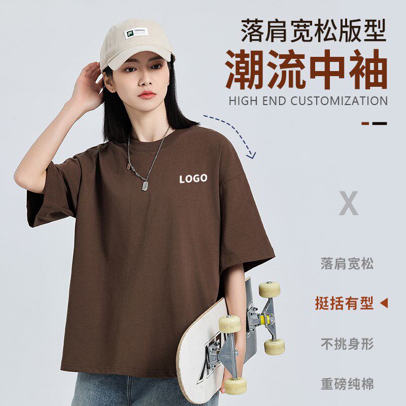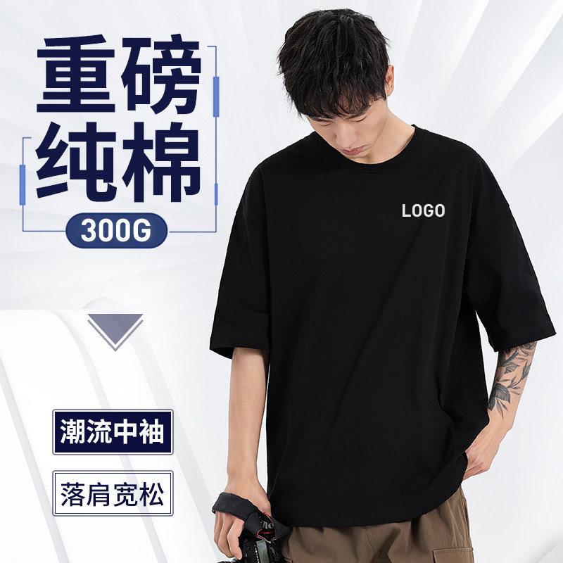 📚 300克重磅黑色纯棉t恤定制加厚宽松落肩工作服印字团体文化衫刺绣