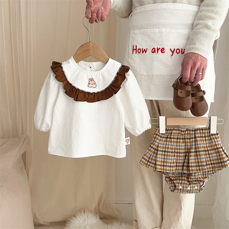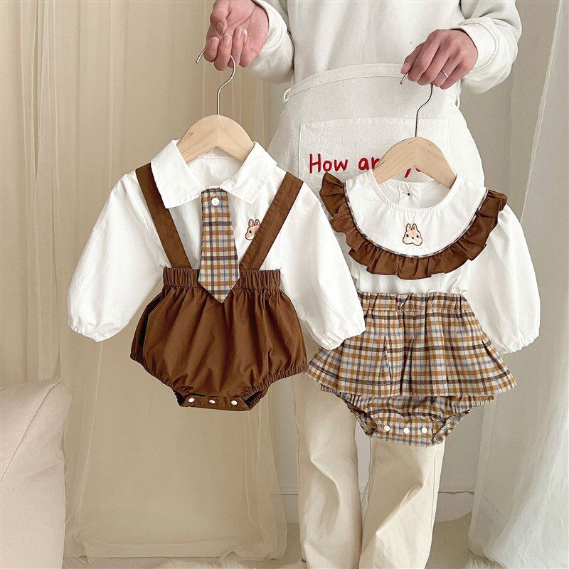 📚 韩版龙凤胎春款学院风兄妹百天女宝宝哈衣背带裤婴儿包屁衣服套装