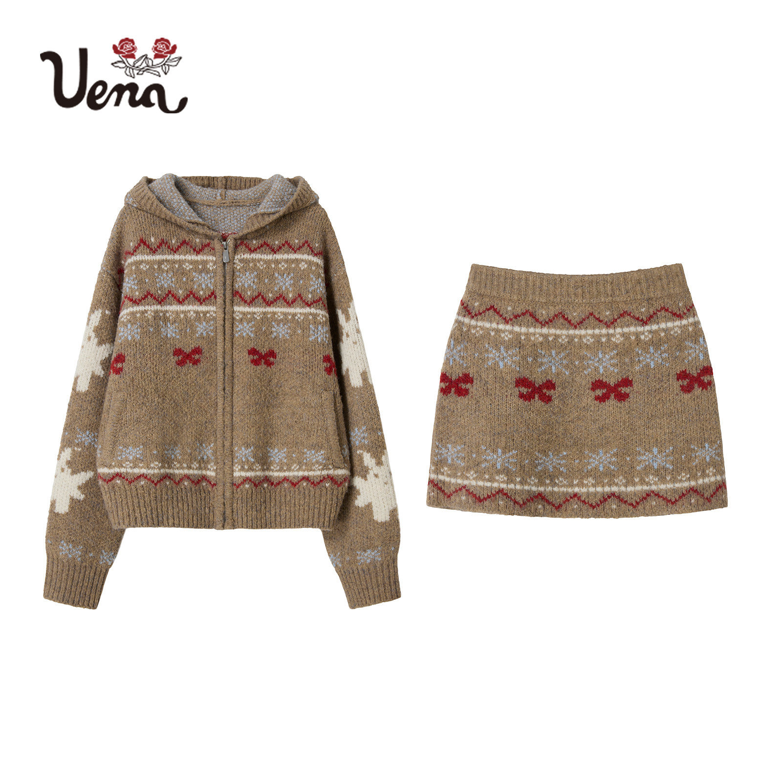 📚 【环岛梦游】Uena复古棕色费尔岛花纹连帽毛针织开衫半身裙套装