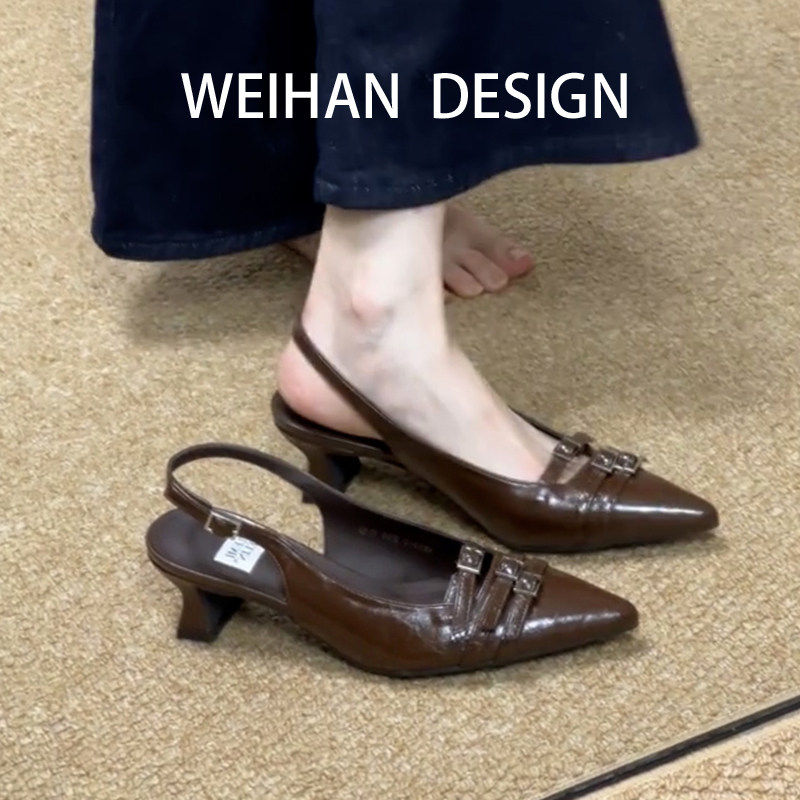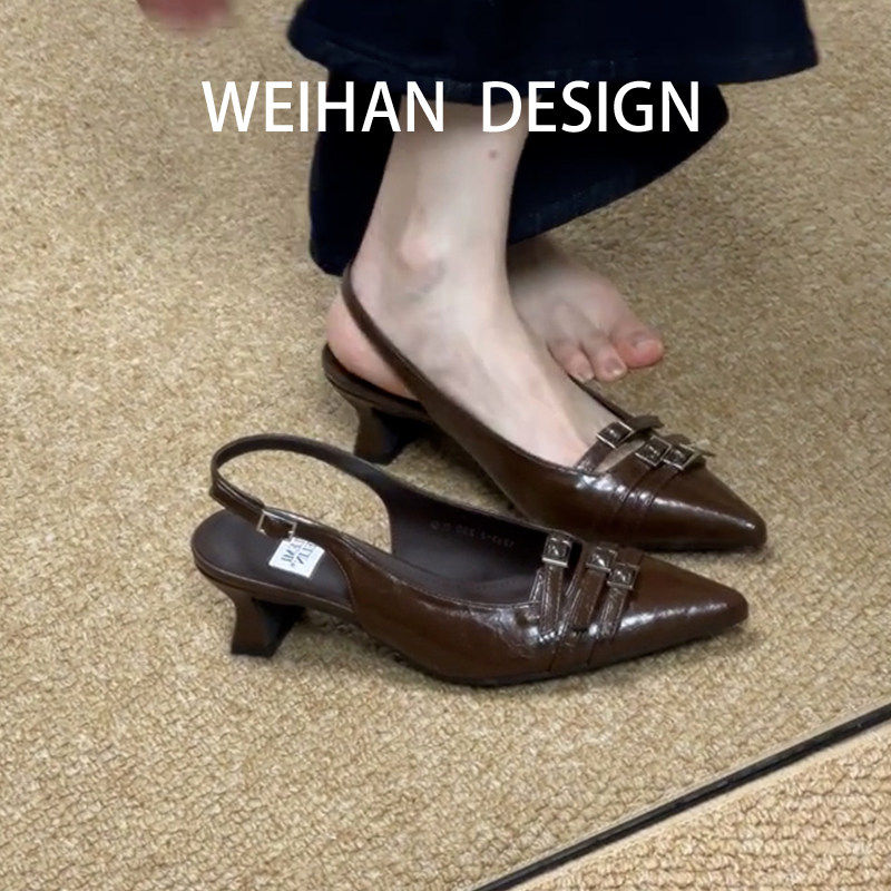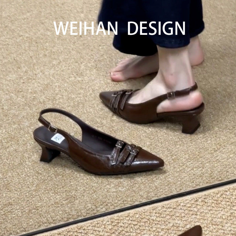 📚 羊皮版!通勤风尖头细跟包头高跟鞋漆皮小猫跟凉鞋女名媛法式单鞋