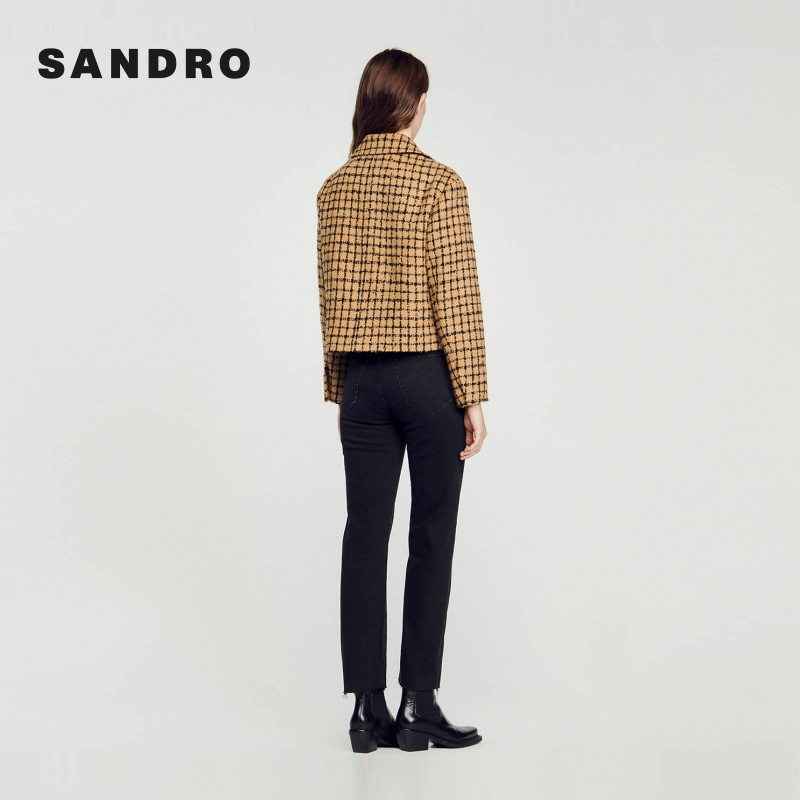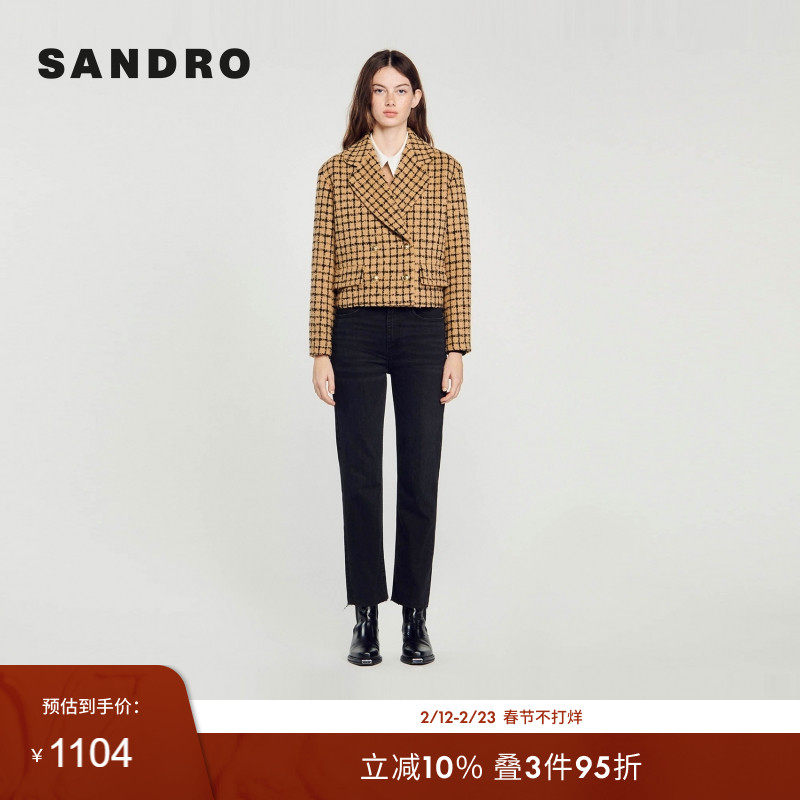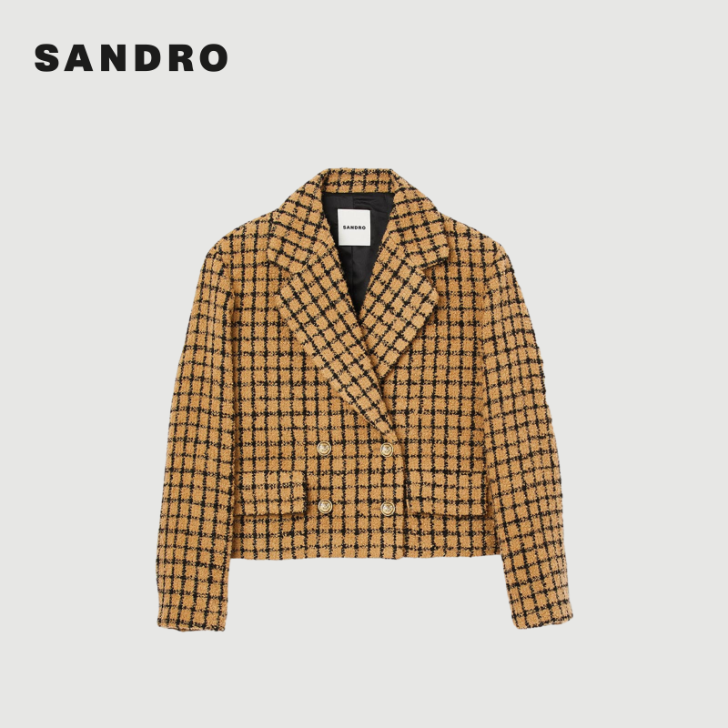 📚 SANDRO Outlets秋冬女装美拉德格纹粗花呢羊毛混纺短款西装外套