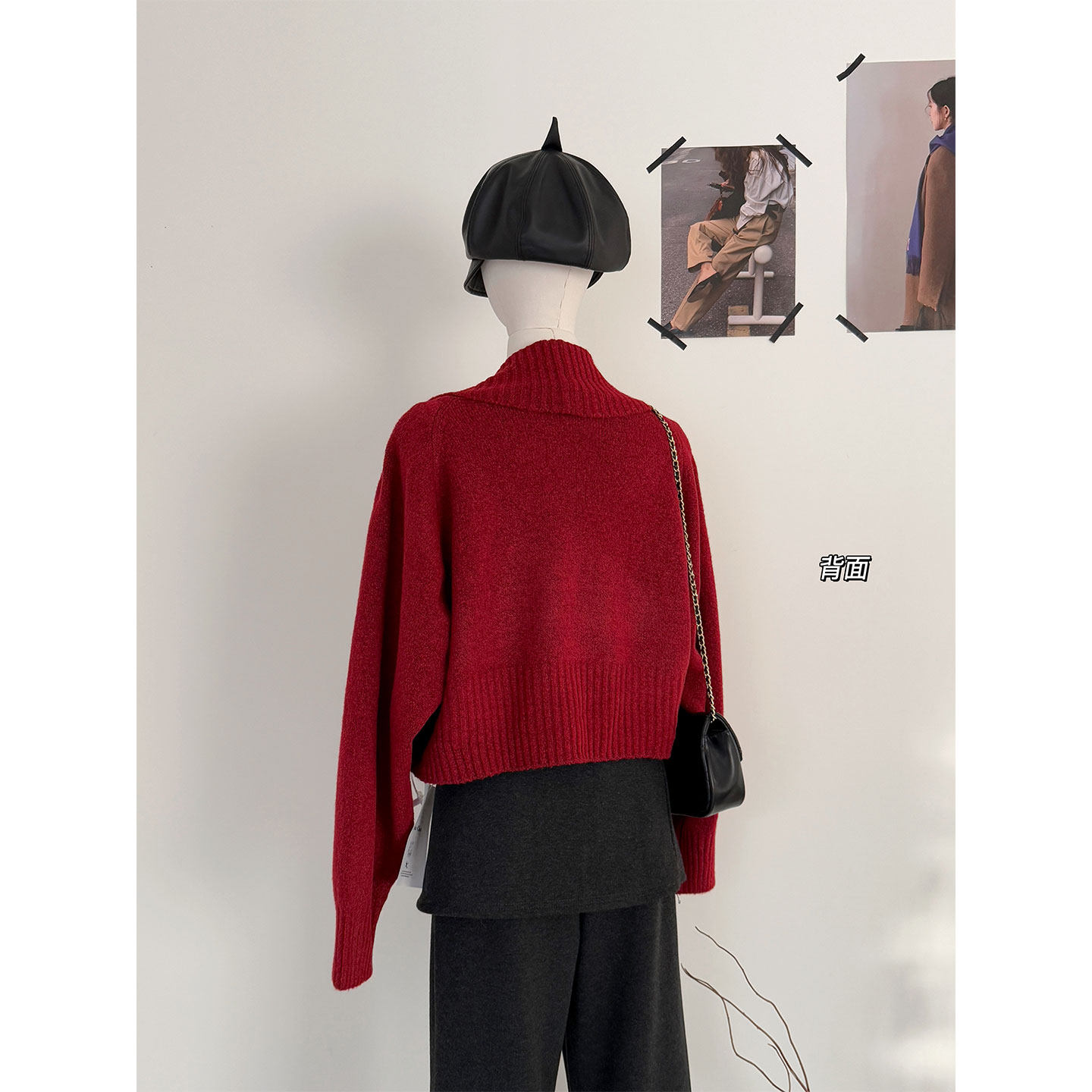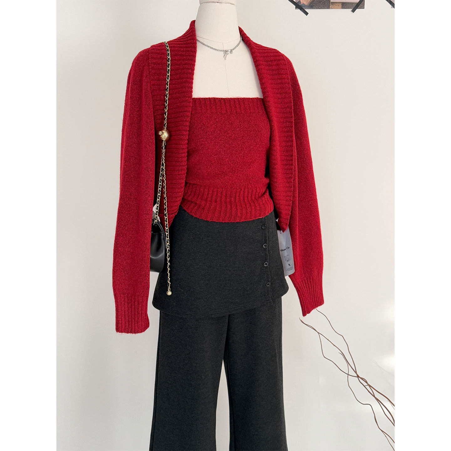 📚 小蛮腰系列!新年氛围感红色针织抹胸+短款毛衣披肩开衫两件套装