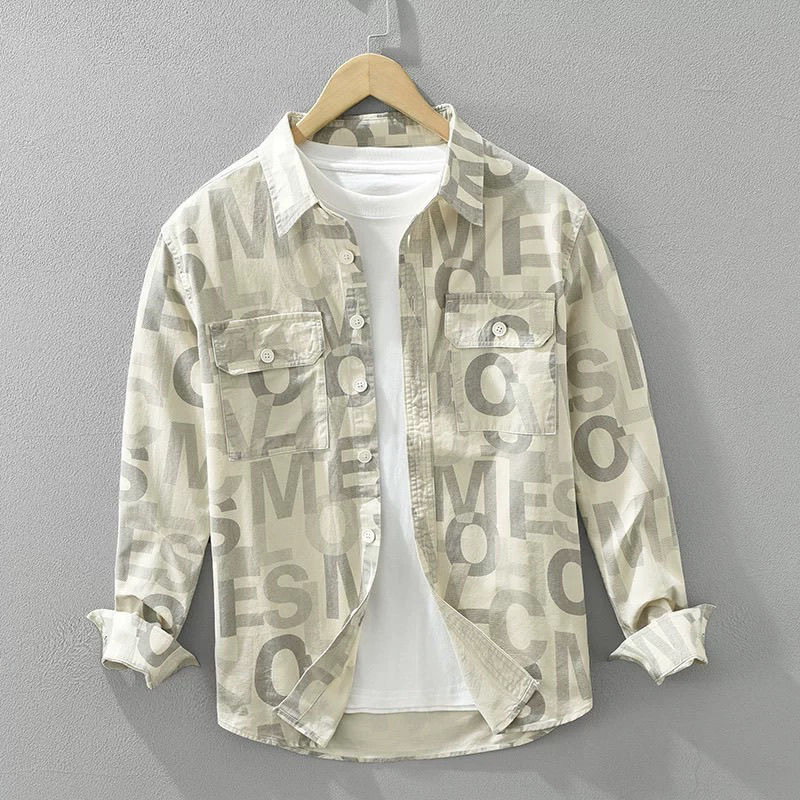 📚 水洗纯棉字母印花长袖衬衫男士秋季日系工装休闲衬衣全棉翻领外套