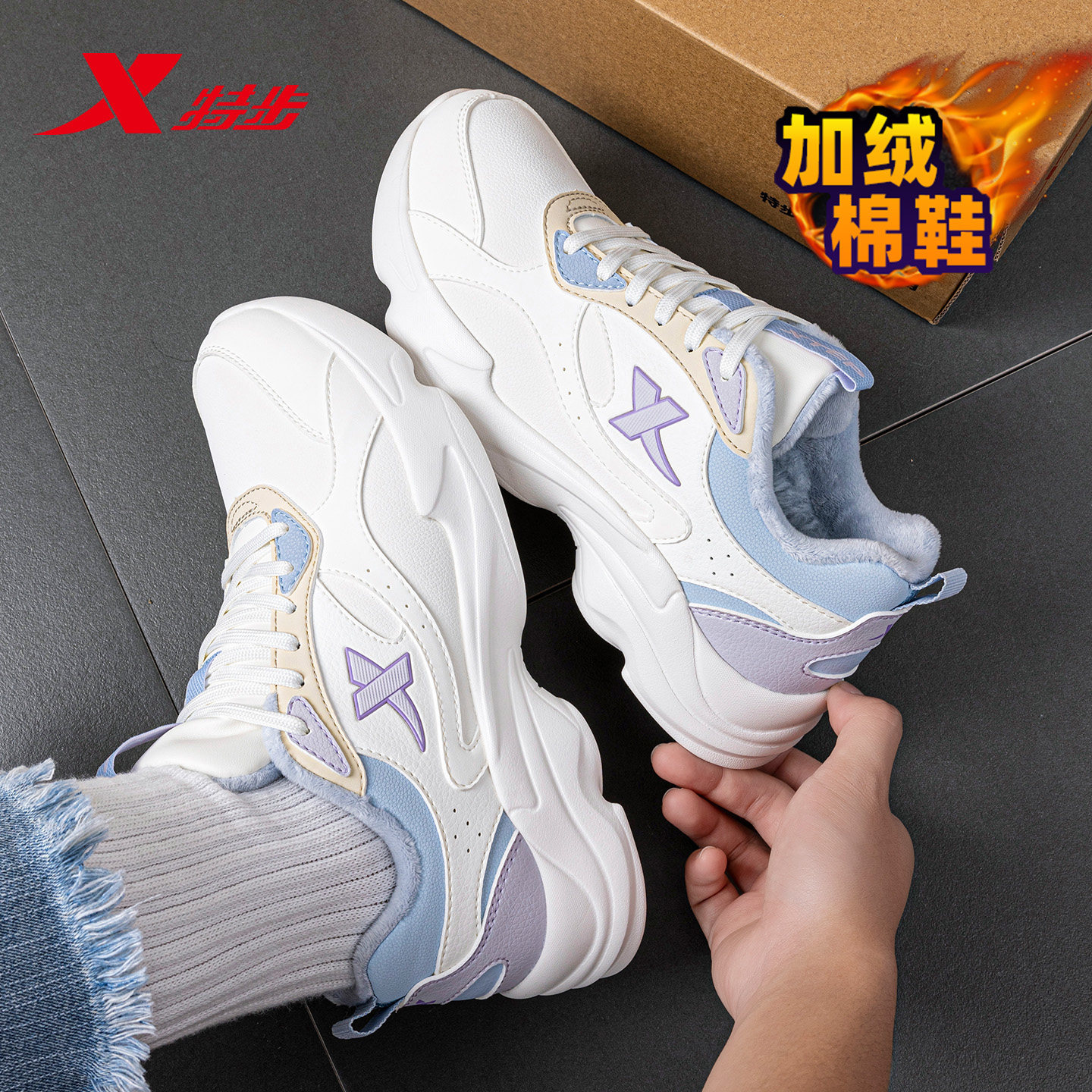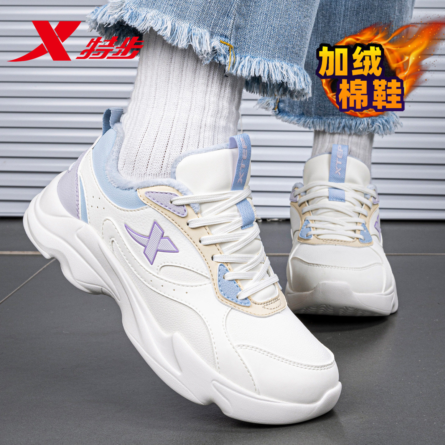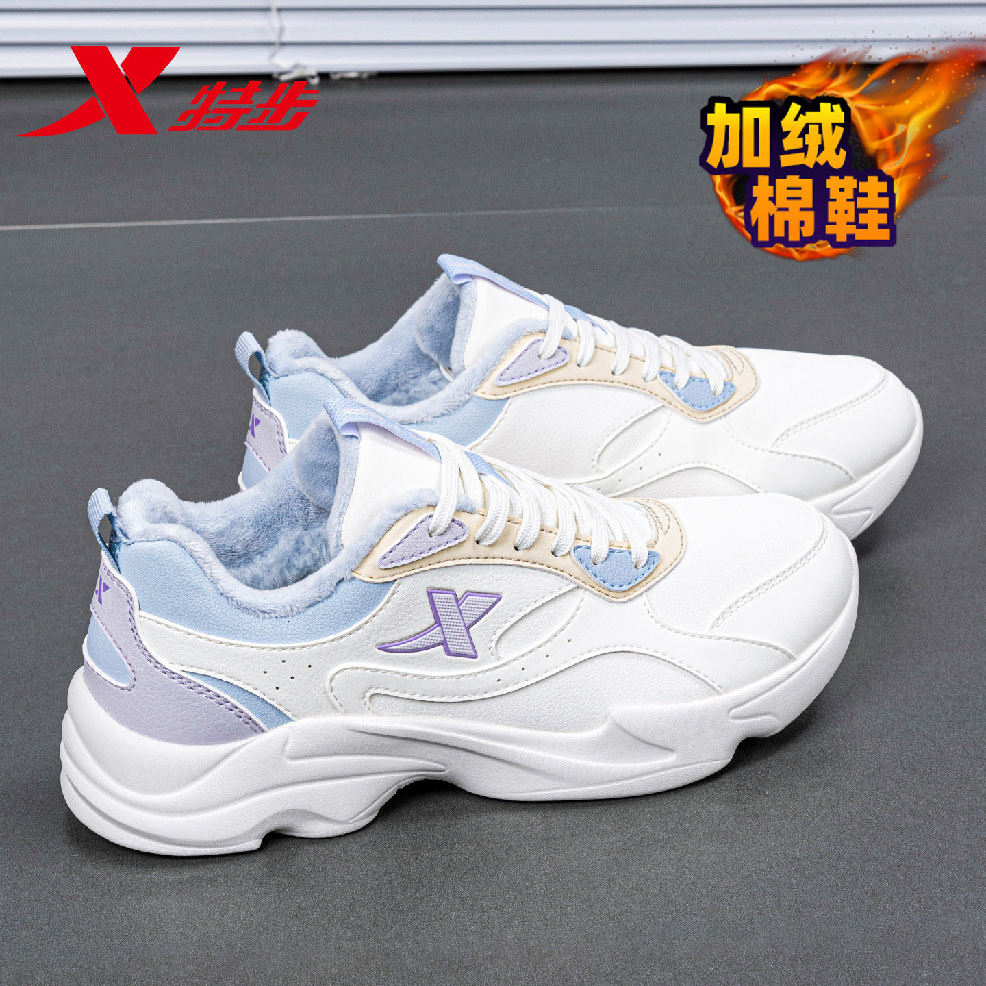 📚 特步女鞋春季棉鞋加绒保暖加厚皮面防水休闲鞋子女款初中生运动鞋