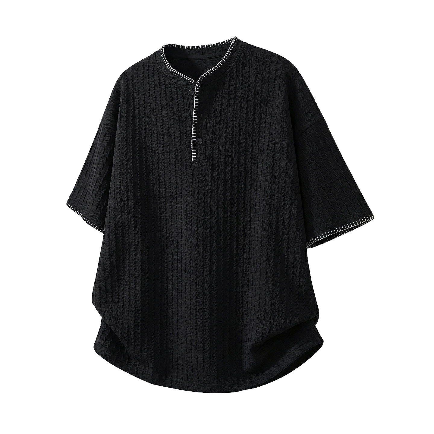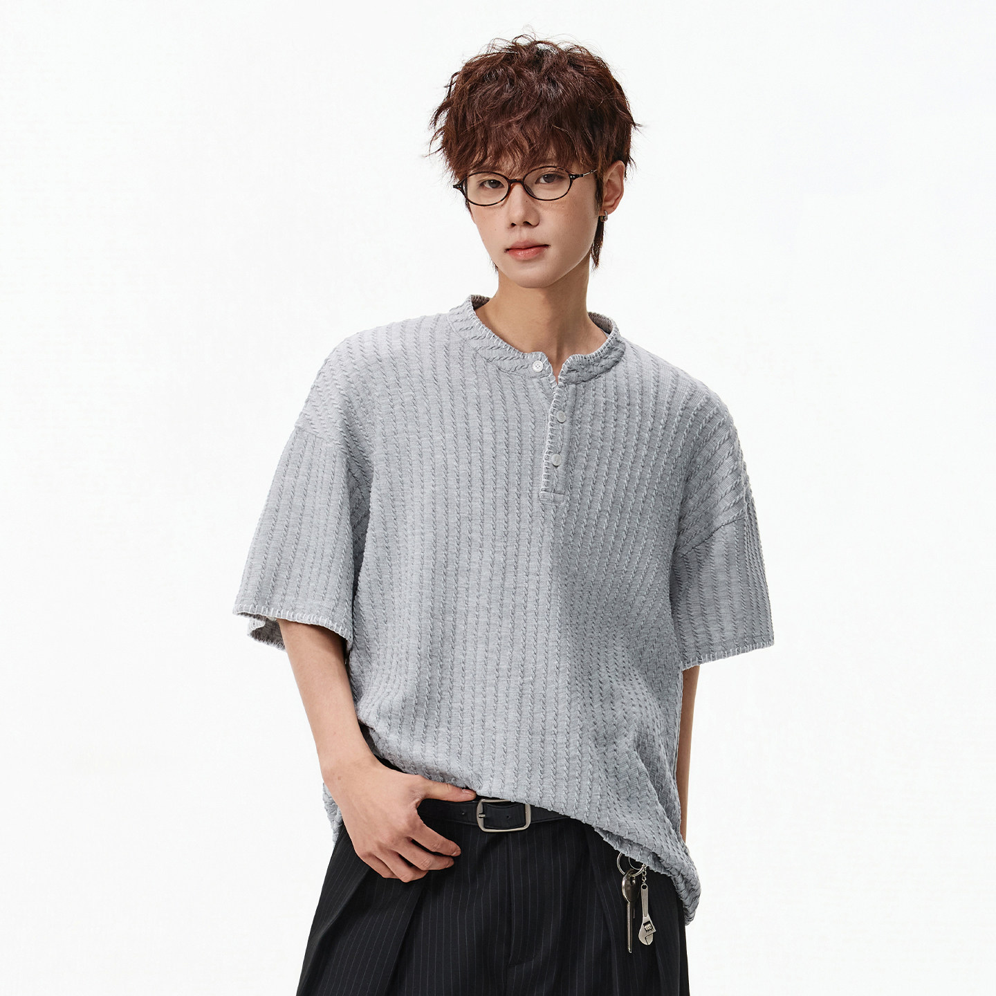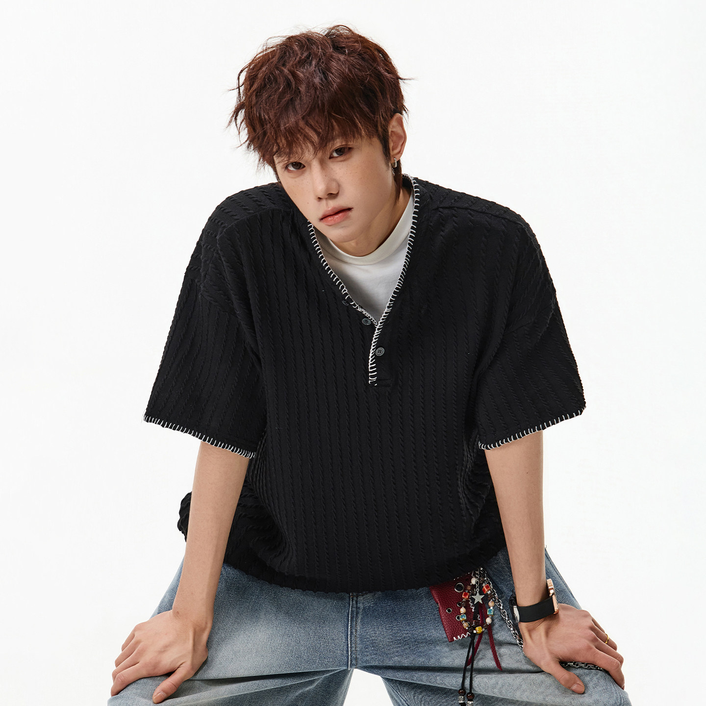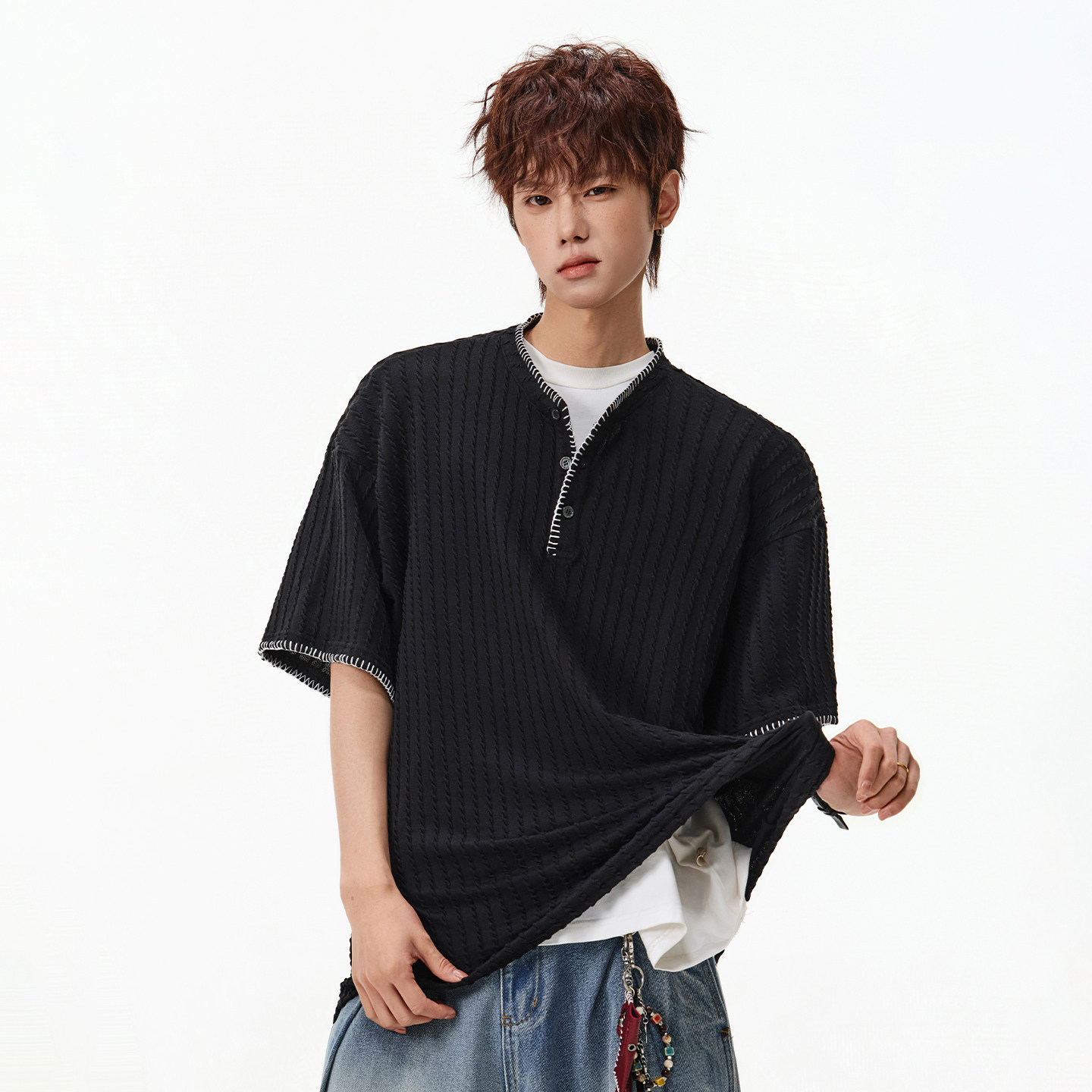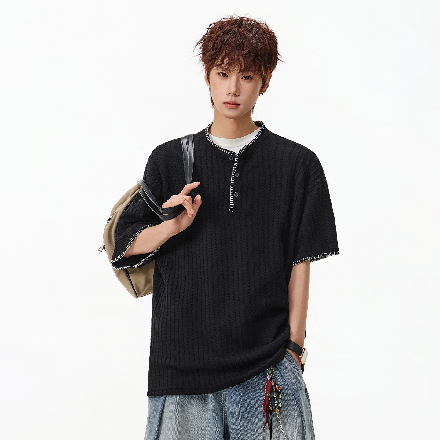 📚 WASSUP美式复古老钱风亨利领针织短袖t恤男夏季宽松情侣半袖上衣