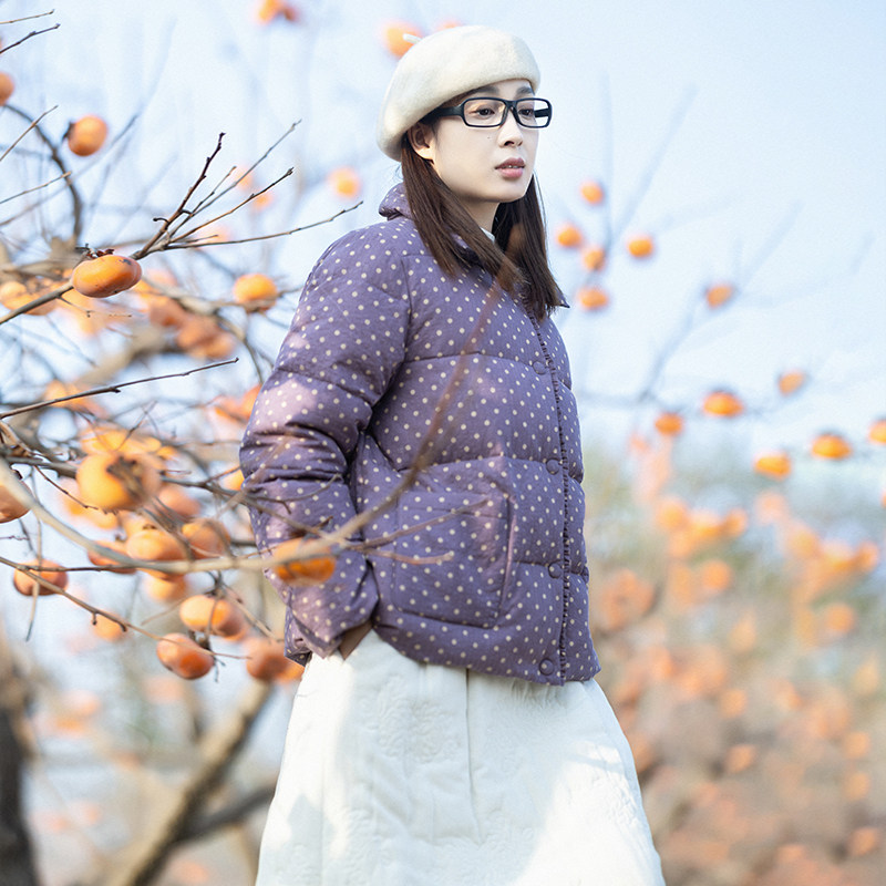 📚 【暮山紫依】文艺翻领波点印花羽绒服女2025冬季紫色加厚小款外套