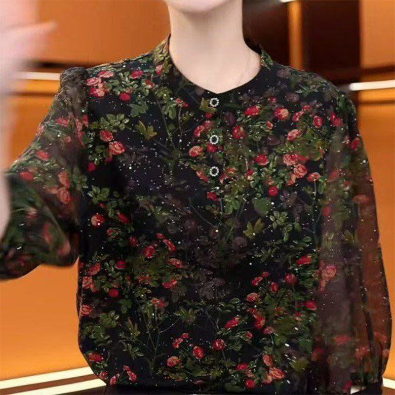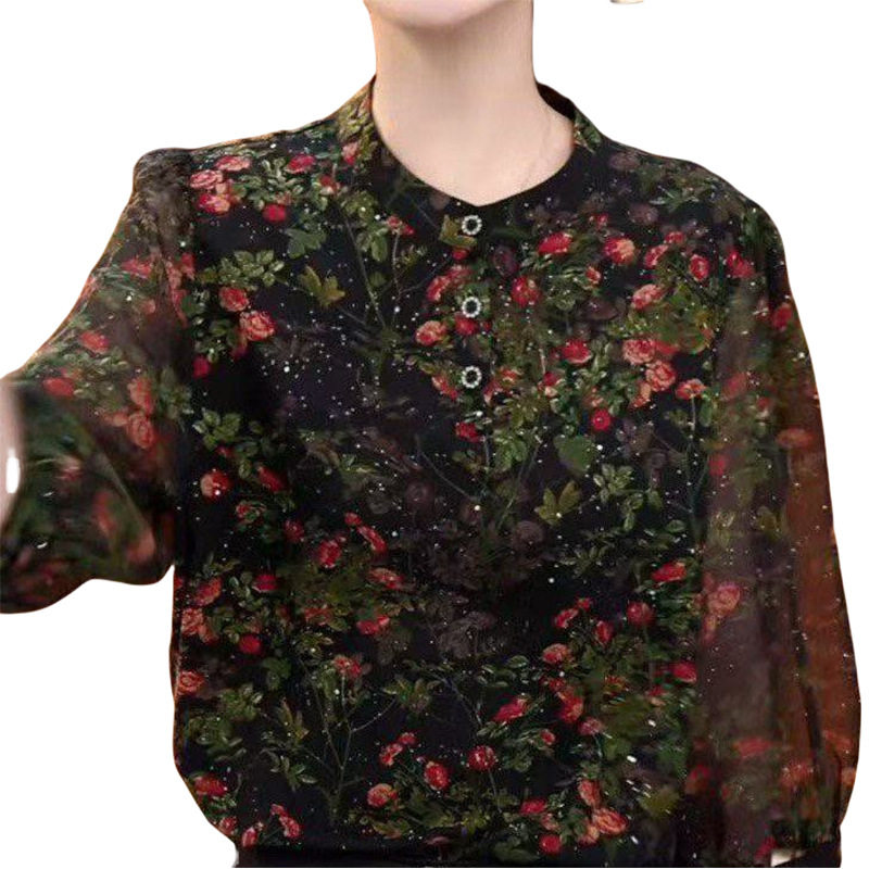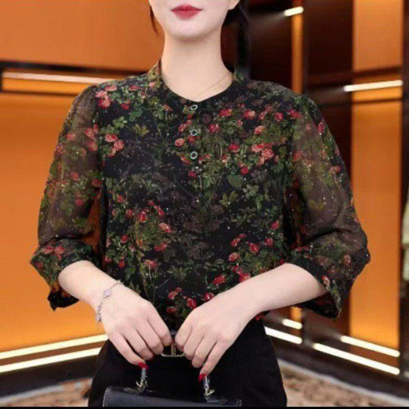 📚 雪纺衬衫黑色显瘦七分袖圆领时尚妈妈装减龄洋气碎花衬衫女