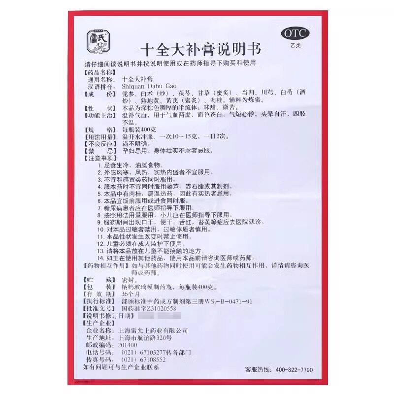 📚 雷氏十全大补膏400g/瓶温补气血女气血虚血调理口服药