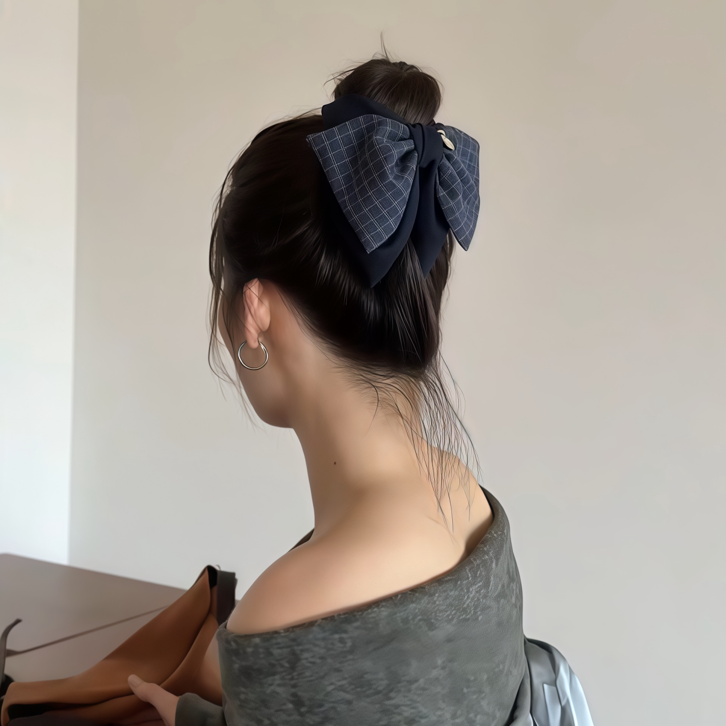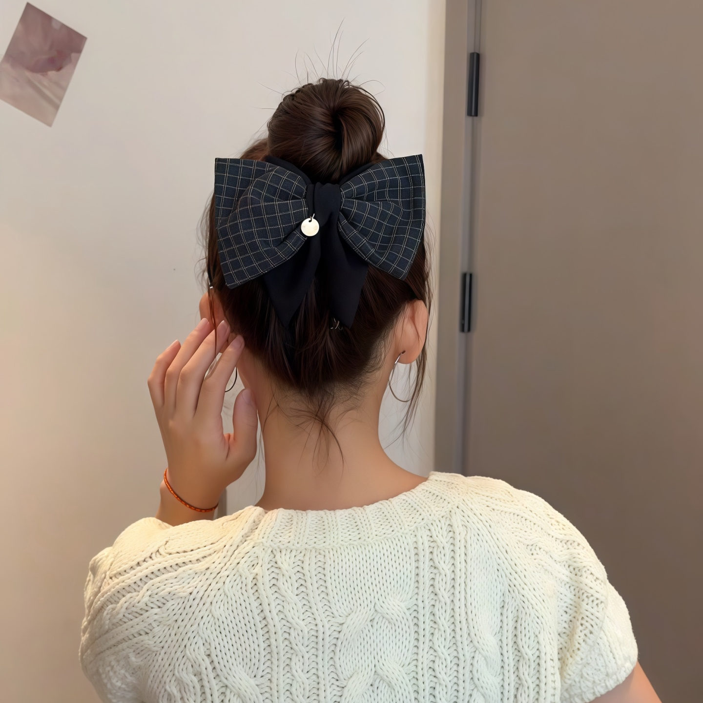 📚 双层格子蝴蝶结三角抓夹女后脑勺盘发鲨鱼夹半扎发马尾夹发卡头饰