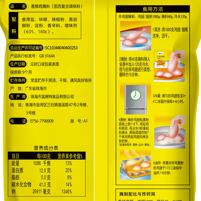 📚 富琳特微辣香辣炸鸡腌料1kg低辣鸡翅调料辣椒类腌渍鸡腿鸡调味料