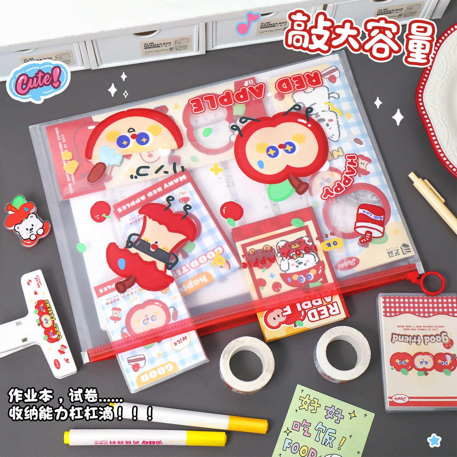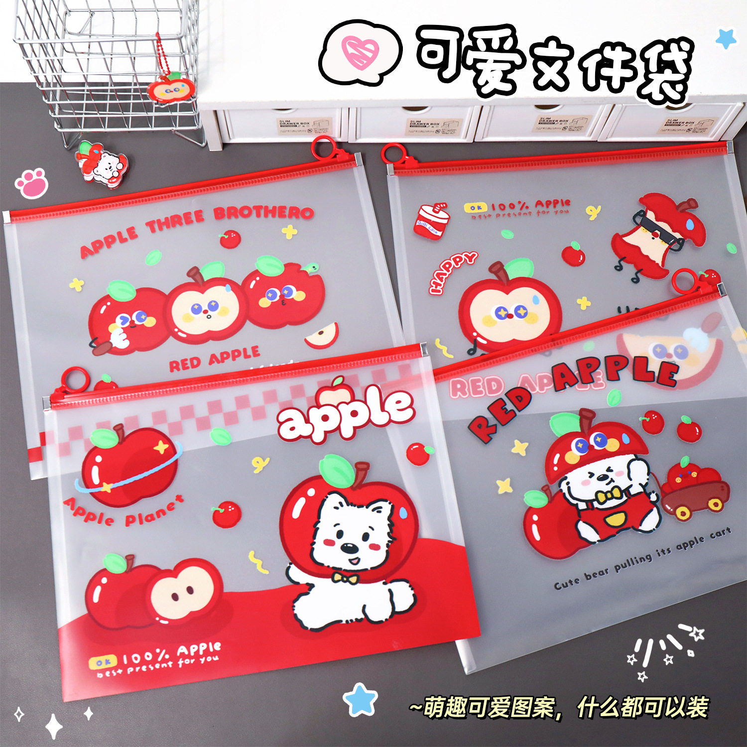 📚 红苹果文件袋卡通PP拉环袋学生大容量A4试卷收纳袋防水资料收纳袋