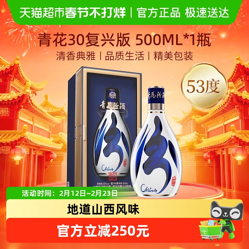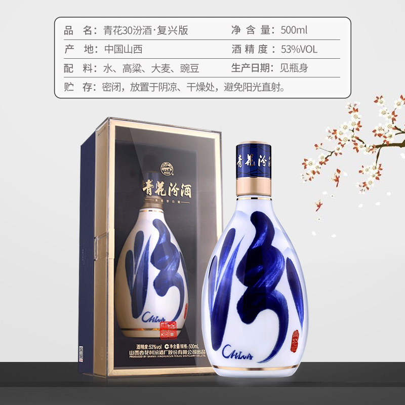 📚 汾酒山西杏花村53度青花30复兴版500ml*1瓶清香白酒送礼商务宴请