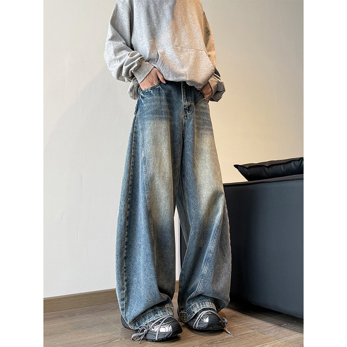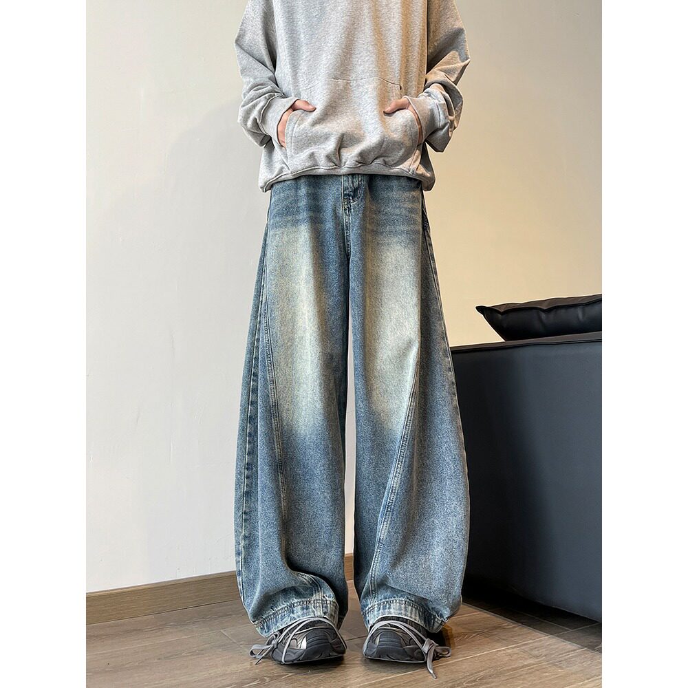 📚 美式阔腿弯刀牛仔裤男潮牌长裤直筒大码宽松baggy复古拖地裤子男