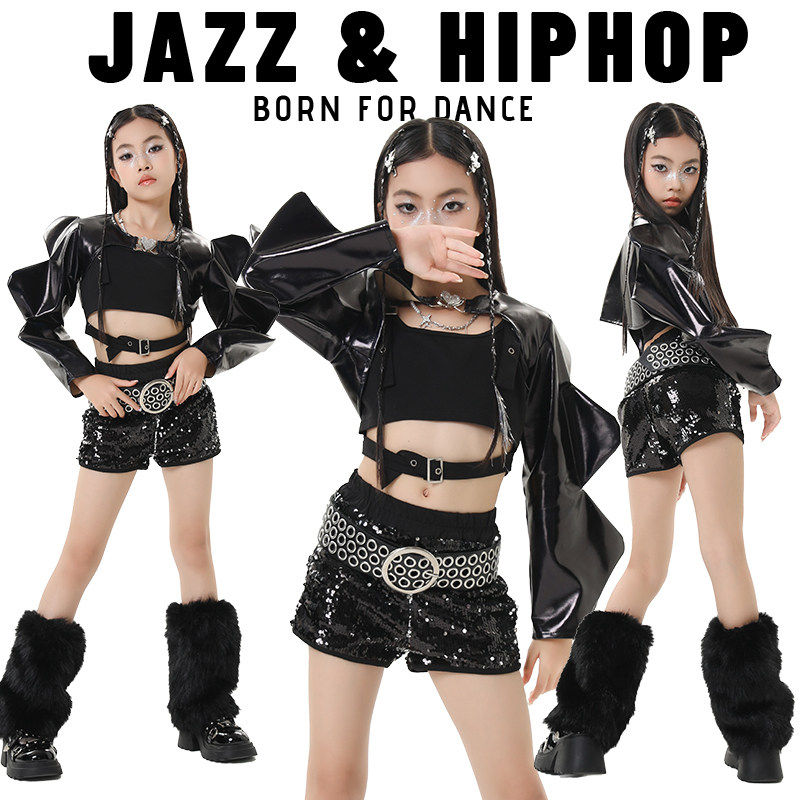 📚 爵士舞服装女童黑色皮上衣潮酷女团打歌服儿童演出服模特走秀套装