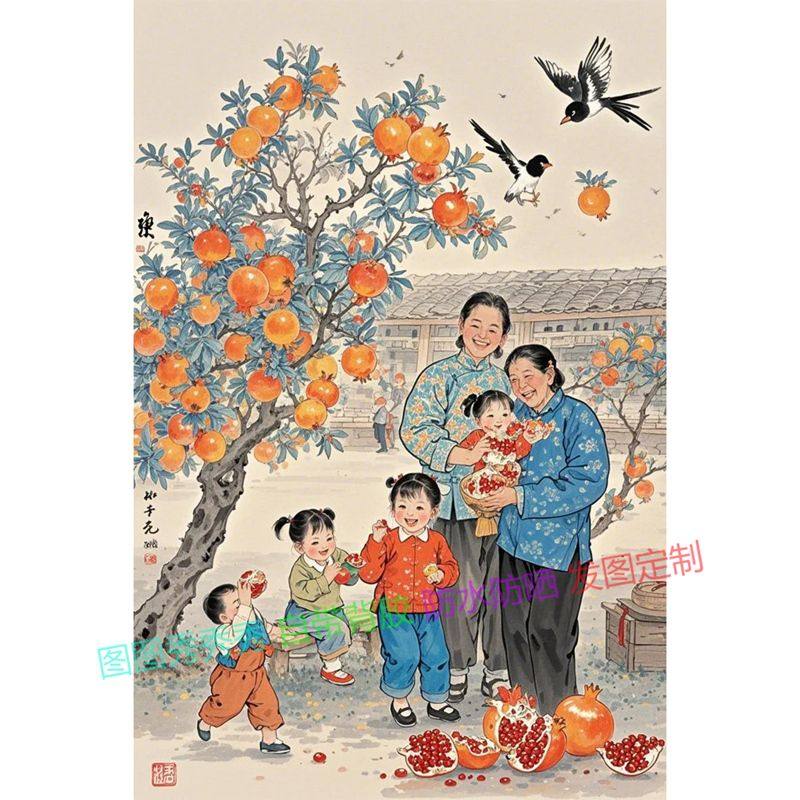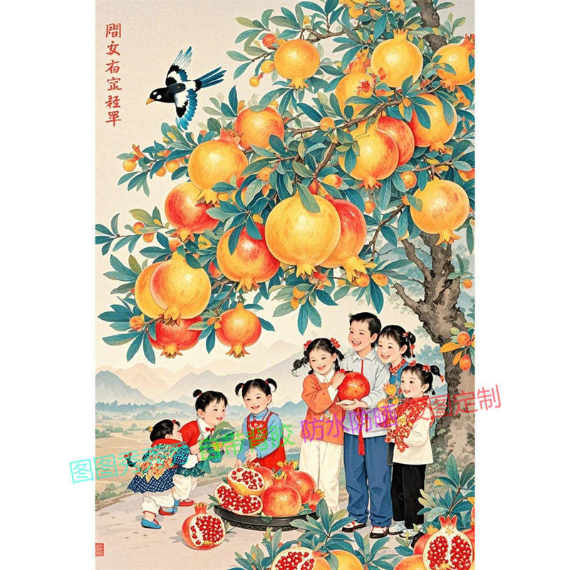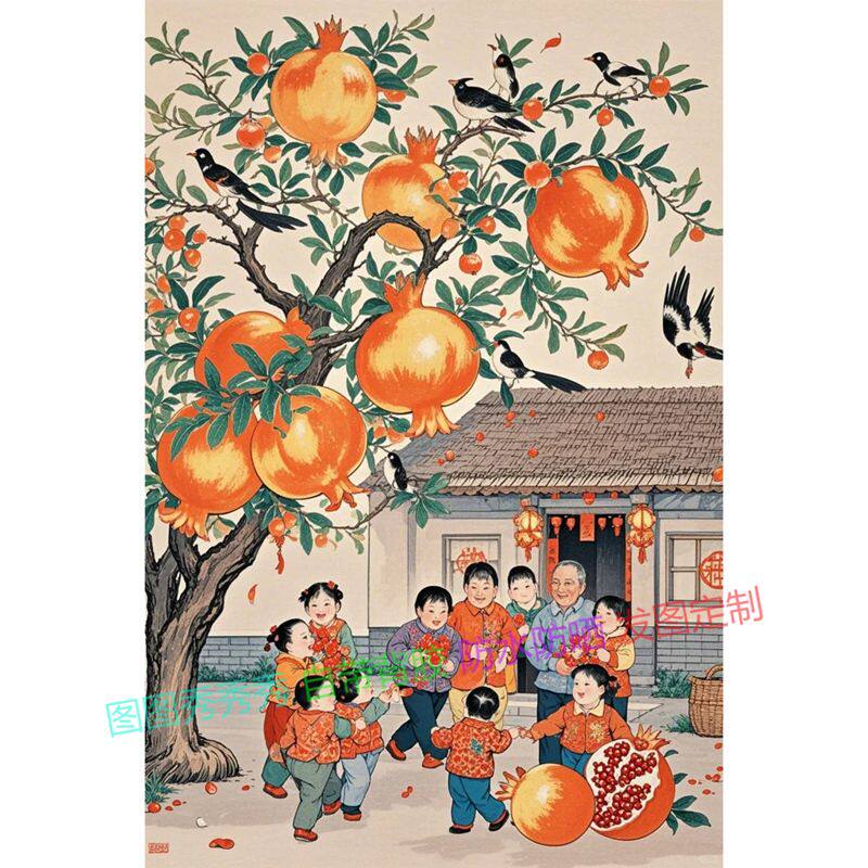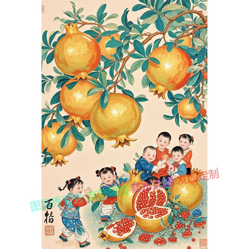 📚 怀旧复古年画福娃娃高清贴画客厅卧室墙面装饰墙贴多子不干胶贴纸