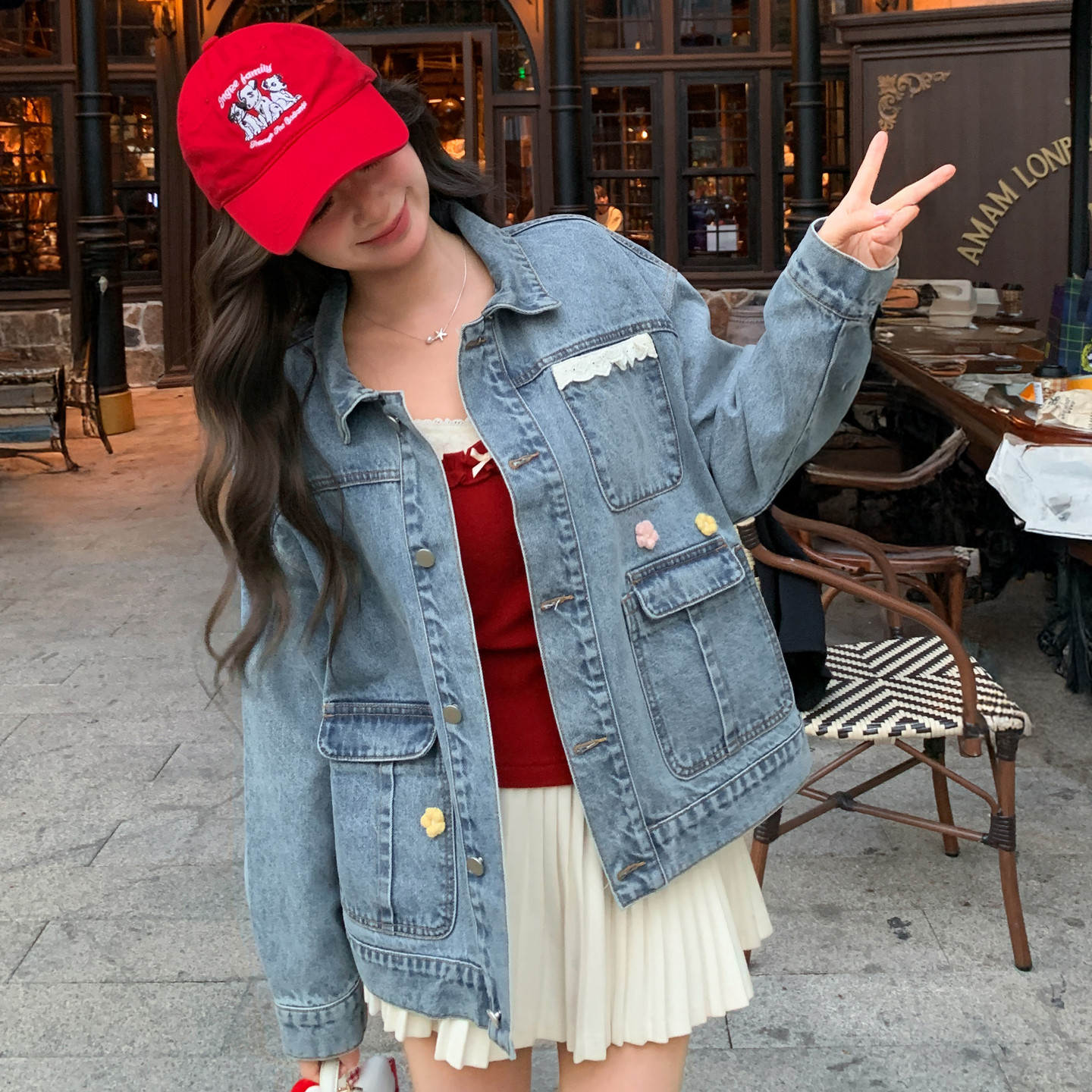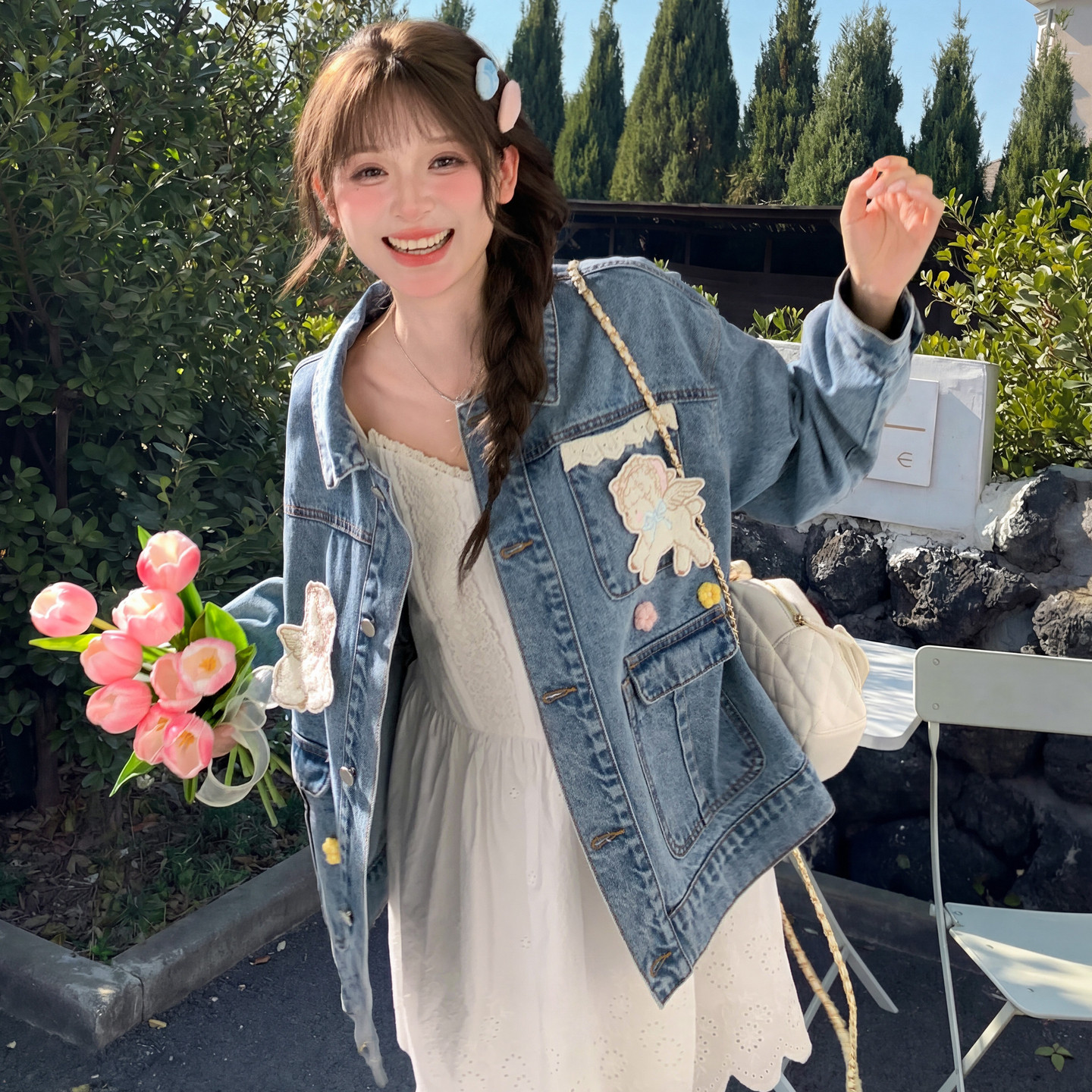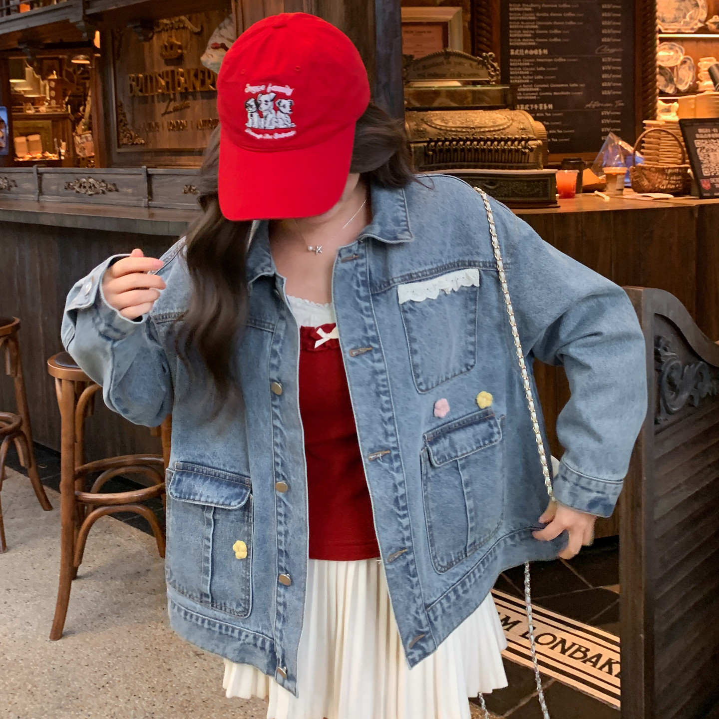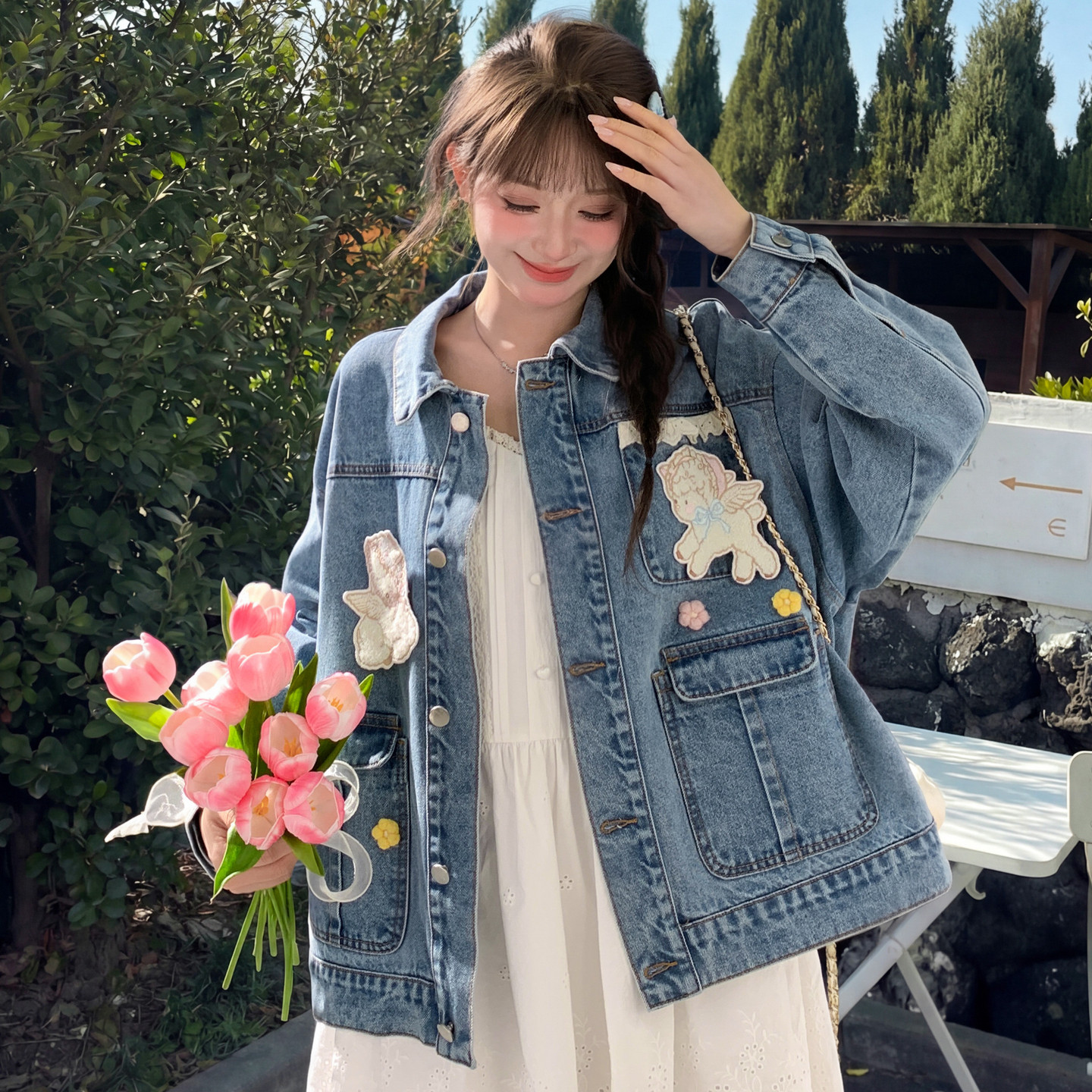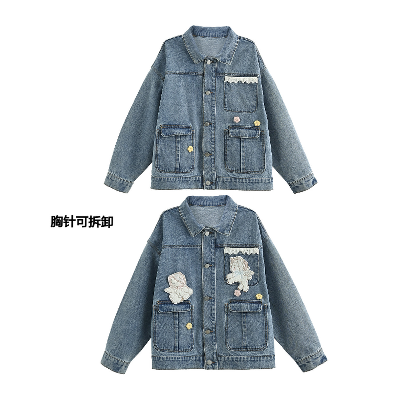📚 上新限时88折森女部落萌趣蕾丝拼接设计感牛仔外套女甜美宽松外搭