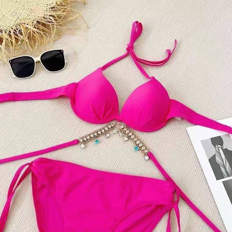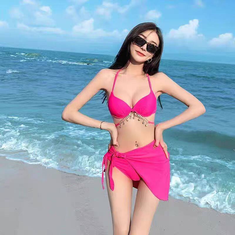 📚 带钢托带胸垫比基尼泳衣女三件套分体式人鱼链条玫红色海边泳装夏