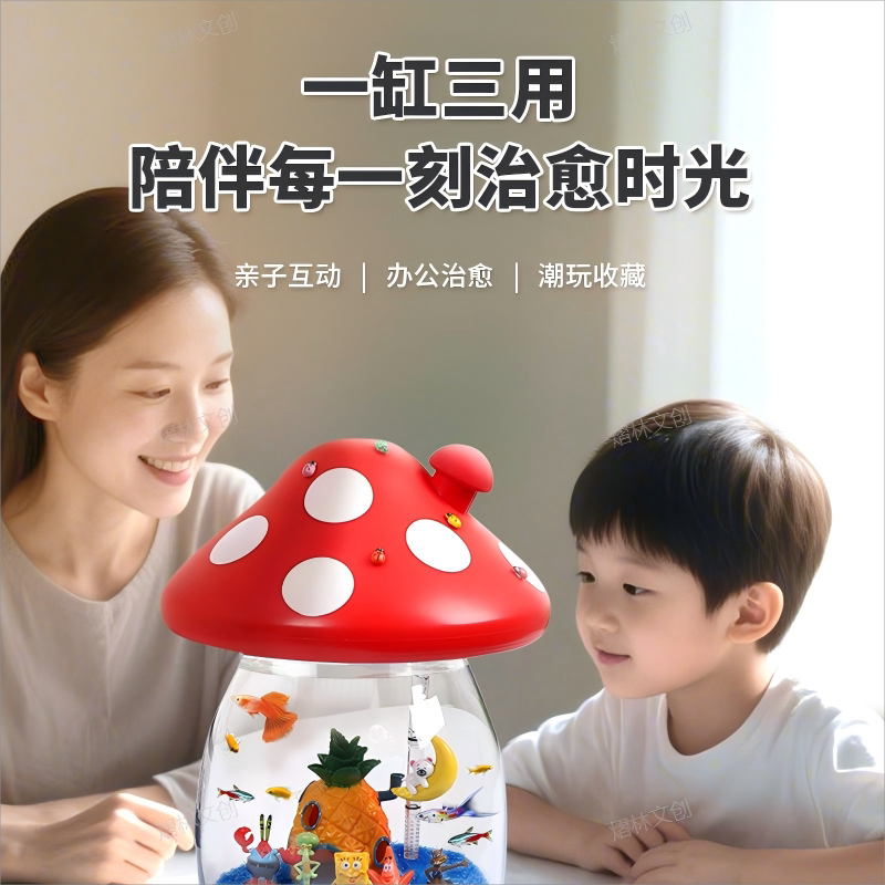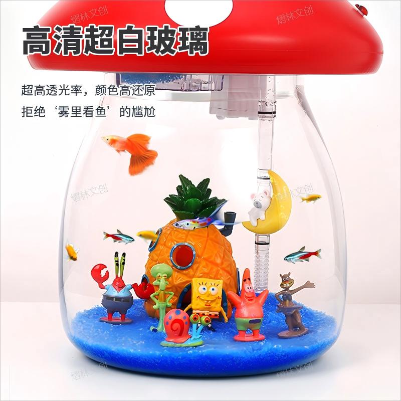 📚 新手养鱼蘑菇玻璃鱼缸桌面创意小鱼缸卡通造景静音增氧过滤小礼物