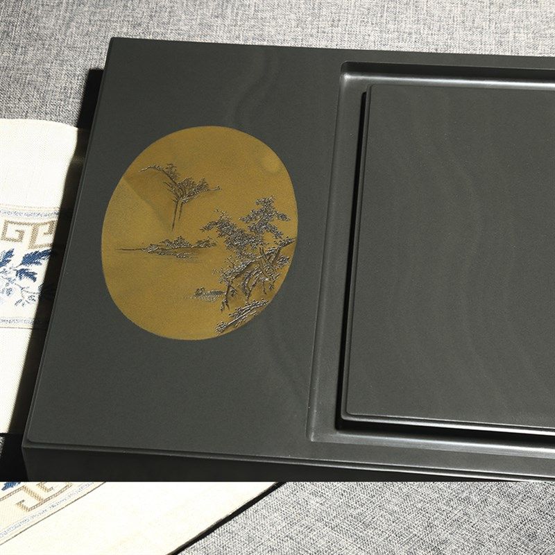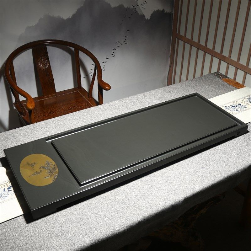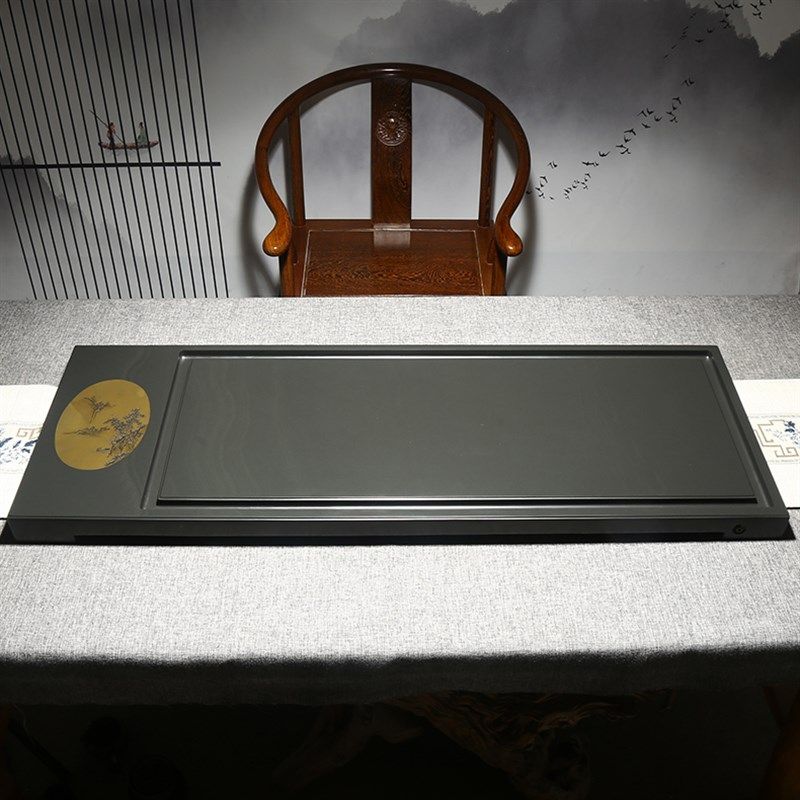 📚 歙砚原石排水茶盘 长方家用中式茶台 黑龙尾镶嵌老坑黄鱼子砚台端