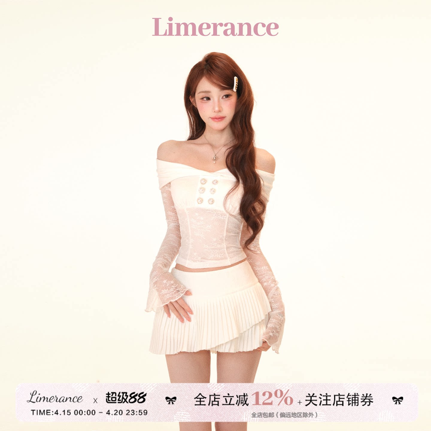 📚 白茶小调 针织翻边一字肩蕾丝拼接上衣交叉牙签褶半裙套装春夏