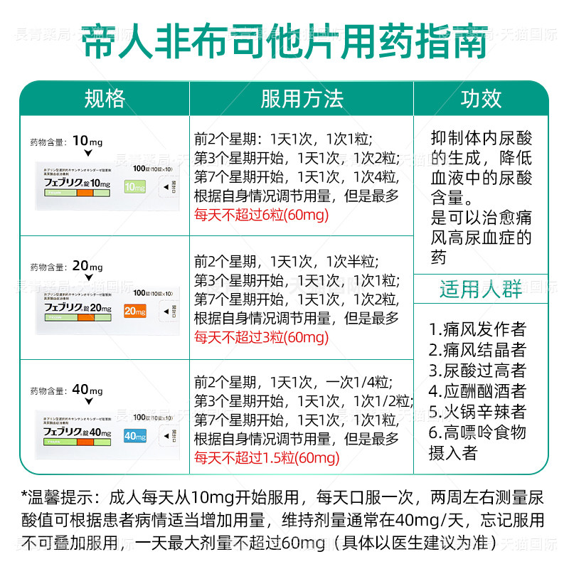 🌈总的来说,帝人痛风20mg日本原装进口非布司他片真的是一款值得推荐的痛风降酸好物。如果你也是痛风患者,不妨试试这款产品,相信它一定会给你带来惊喜!