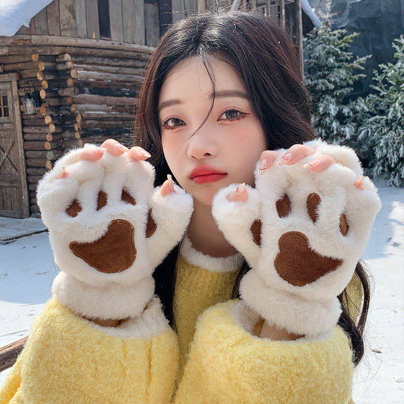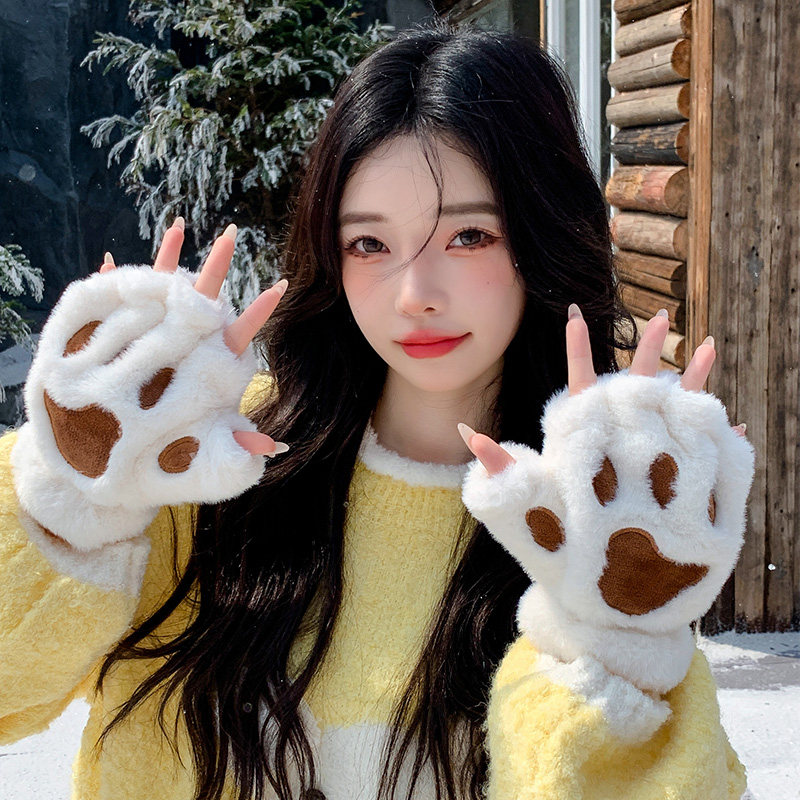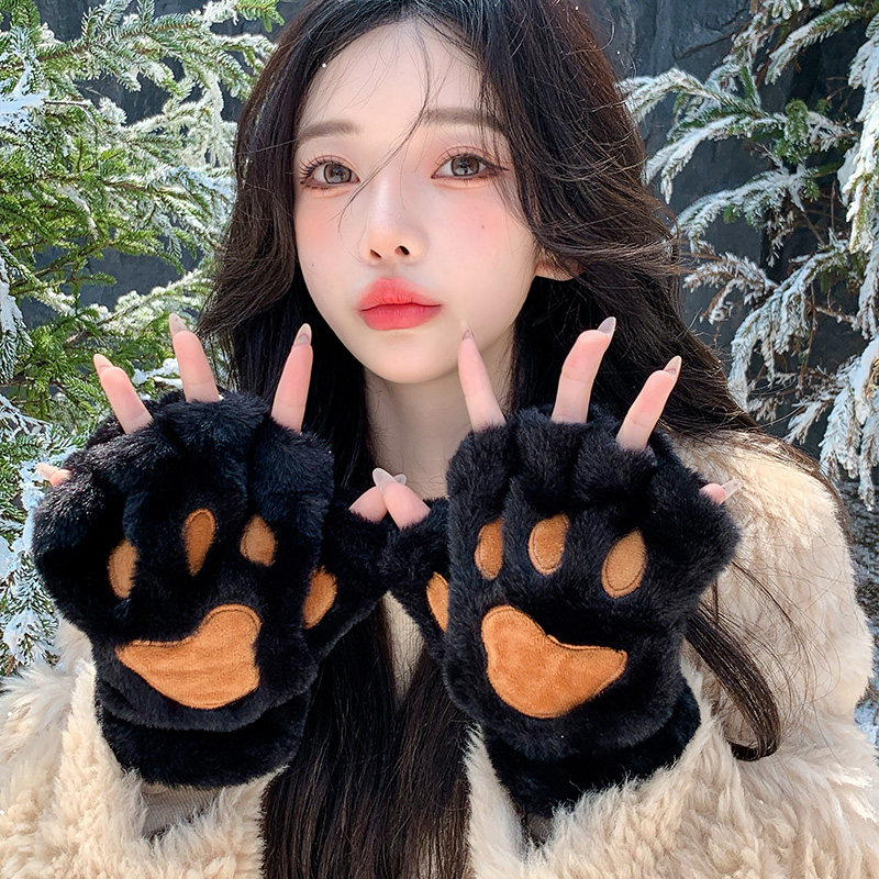 📚 猫爪手套女生冬季半指保暖加绒加厚防寒露指cos毛绒可爱卡通熊掌