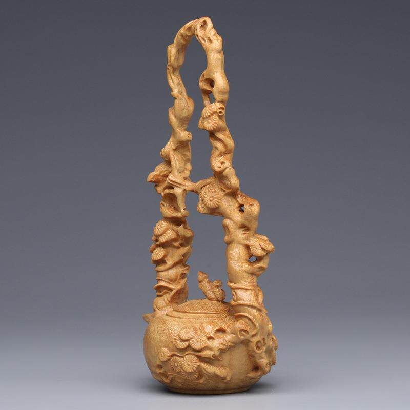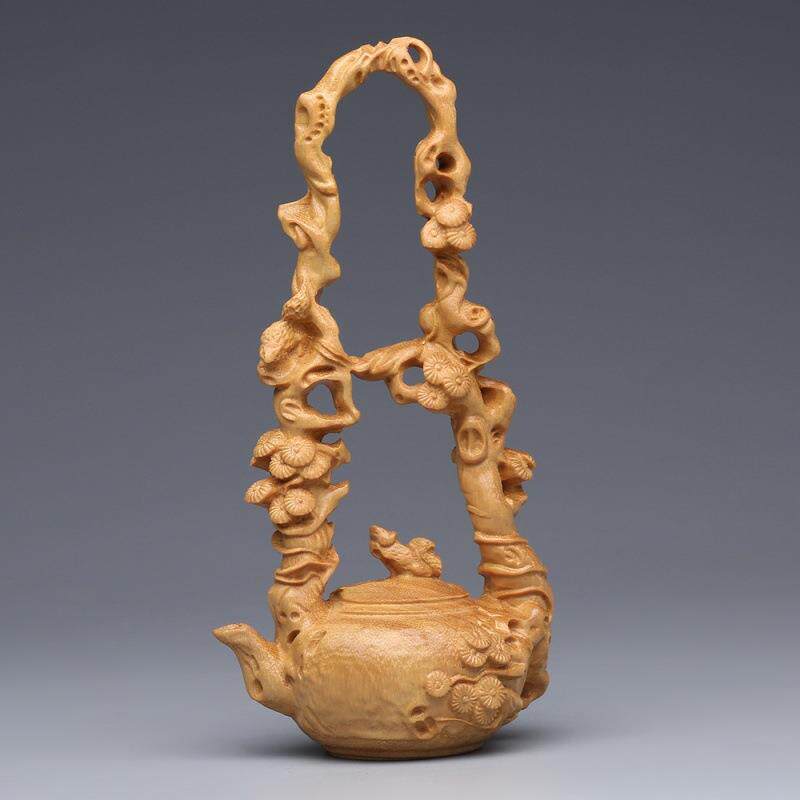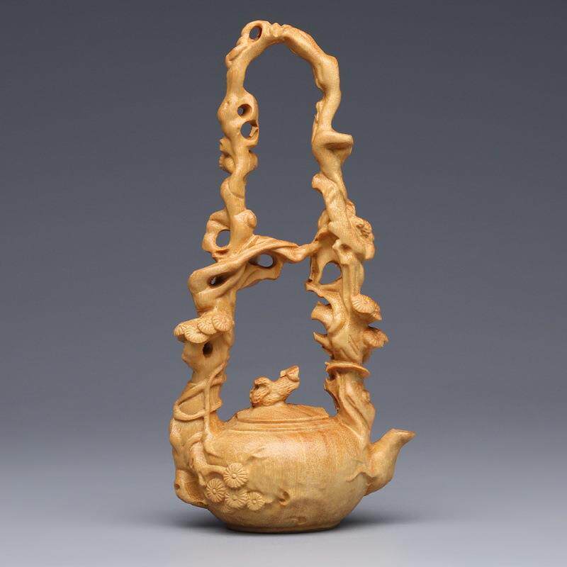 📚 柏木东坡提梁壶雕中崖摆件实木博古架式茶壶家居客厅装饰工艺品