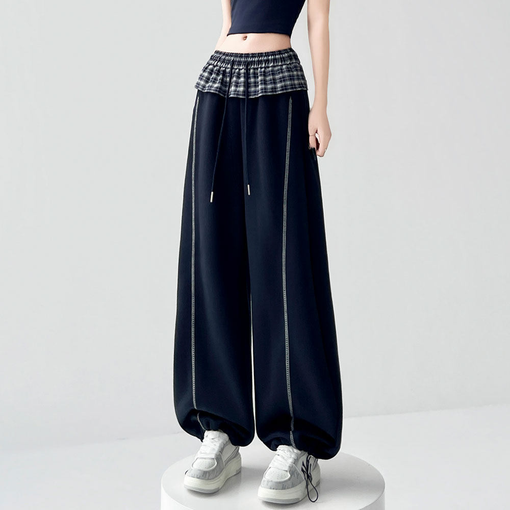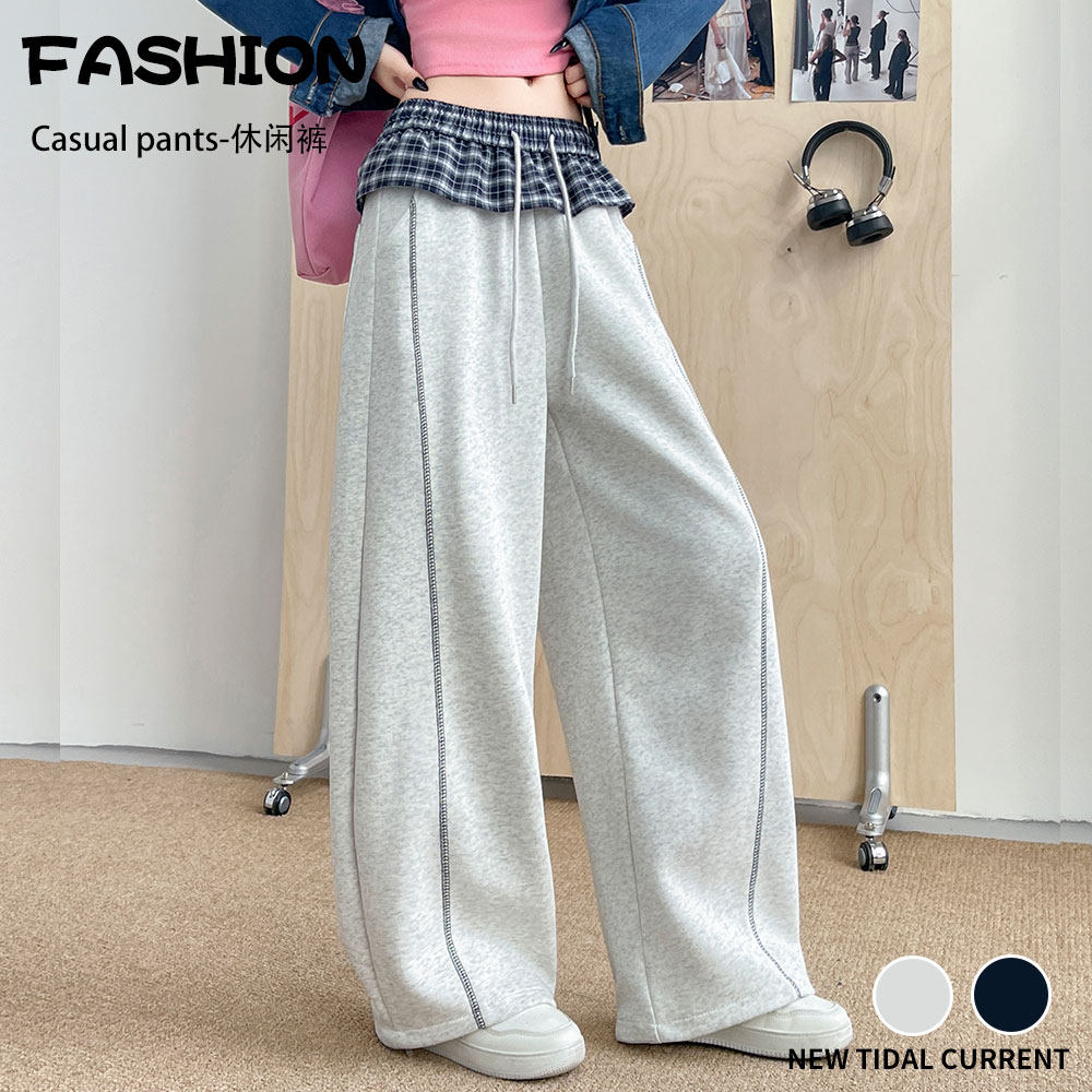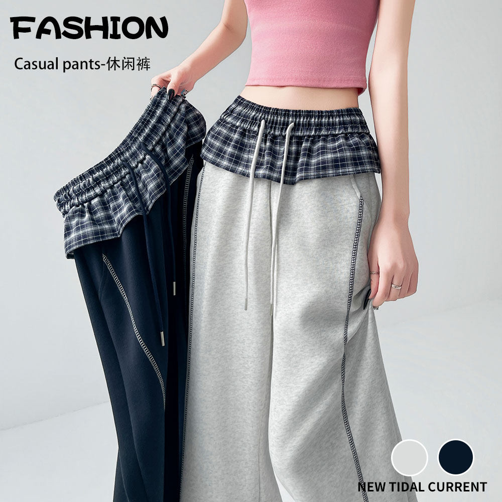 📚 格子拼接弯刀阔腿裤女春夏2026新款初高中学生两穿直筒休闲运动裤