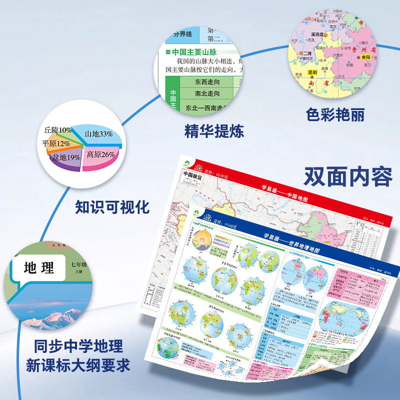 📚 2026新版世界地图和中国地图 初中生专用地理地图学生课堂用约235*320mm 学生地理学习气候政区地形图 高清防水覆膜 学生中考地理